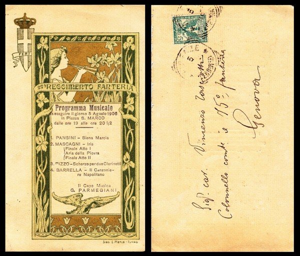 27 Reggimento Fanteria. Programma musicale 5 Agosto 1906, Piazza S. Marco. Pansini, Mascagni, Pizzo, Barrella, G. Parmegiani. Programma viaggiato illustrato stile liberty.