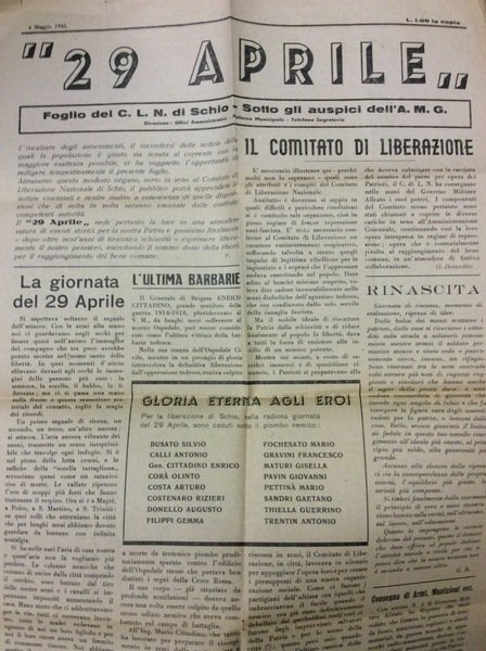 29 APRILE. - Foglio del Comitato di Liberazione Nazionale (C.L.N.) di Schio. Sotto gli auspici dell'A.M.G.