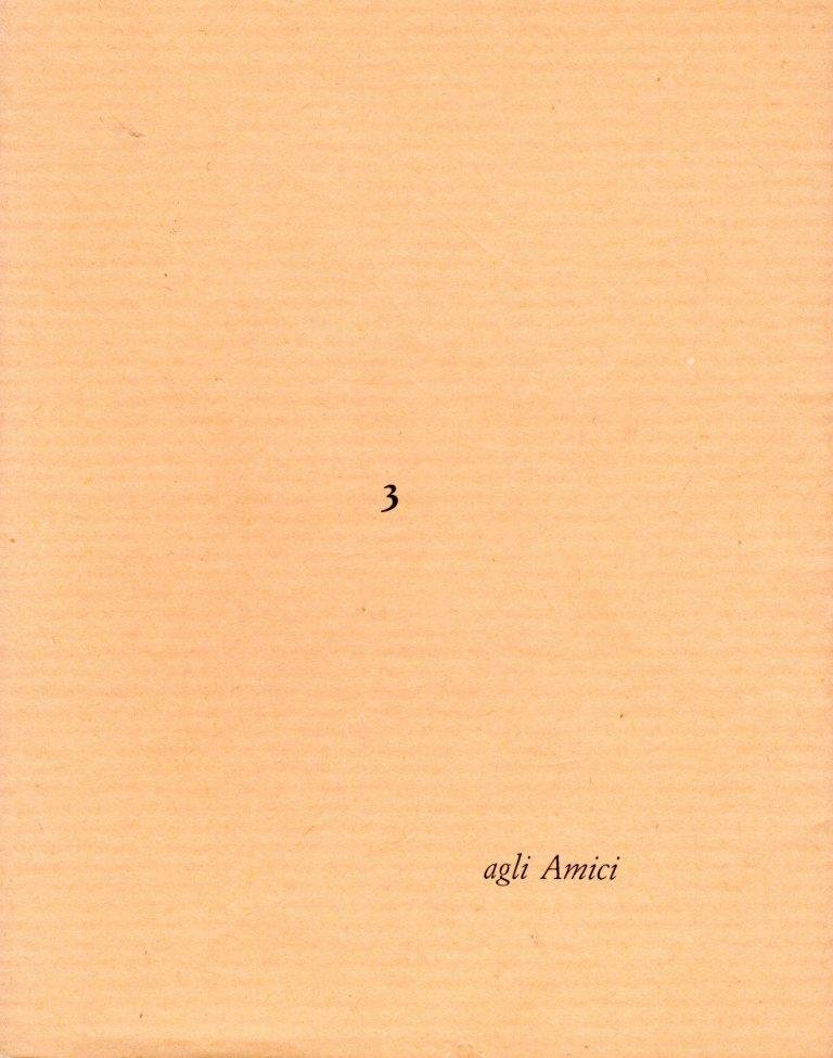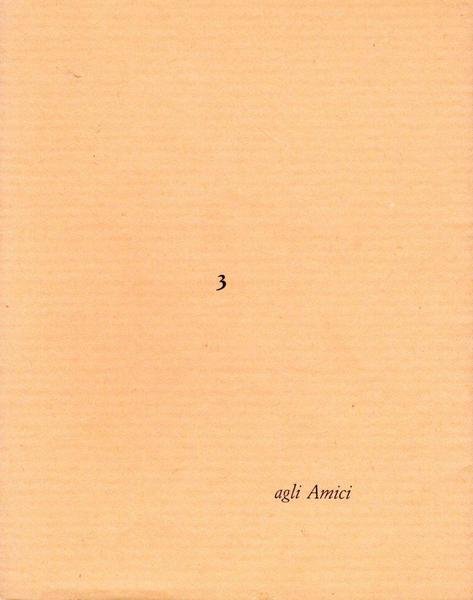3 agli Amici, prima edizione dicembre 1986, formato 12 x 15.<BR>Copertina morbida con alette di colore beige con titoli in nero al piatto anteriore.All'interno una poesia di Dico Carlesi e una litografia di Eugenio Pardini.<BR>Ottime condizioni.