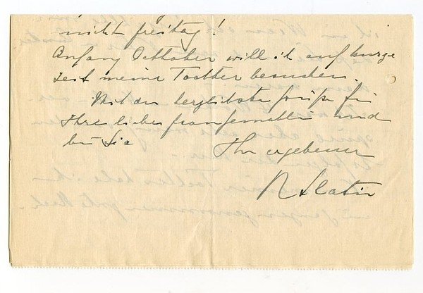 Large 4to. Altogether (1+3+2=) 6 pp. on 4 fols. To a "dear Doctor and friend", mainly reporting on the health of his daughter Anne Marie: "Leider kann ich nicht Donnerstag wie beabsichtigt durch Bozen fahren - Anne Marie fiebert leider so stark daß der Arzt die Reise nicht erlaubt - hoffentlich geht es bald besser so Gott will! [.]" ("Dienstag [1]929"). - "[.] Ich bin schon seit Wochen in Sorge um Anne Maries Gesundheit! Anfang Mai fing sie mit meinem [!] Bronchial Catarrh an, der vorüber ging - aber Temperaturen blieben. Da Dr. Spitaler nach einiger Zeit bekannte, daß er die Ursache nicht finden konnte - ging ich zu Dr. Gara [?] - dort wurde sie genau untersucht und durchleuchtet - der constatirte daß sie stark an Drüsen leidet. Also hieß es Höhenluft - das hilft! Nun ist die Kleine seit 1ten Juni am Vigil Joch - doch die Höhenluft hat nicht die Schuldigkeit gethan - obzwar sie auch nach Vorschrift nur auf dem Liegestuhl lebt! Sie ißt mäßig - schläft gut - sieht nicht schlecht aus - hat aber immer Abends 37.7 - 38° (internal gemessen). Ich habe mich nun entschlossen sie nach St. Blasien im Schwarzwald in das Sanatorium des Prof. Dr. Backmeister zu bringen um sie unter continuirlicher ärztlicher Controlle zu haben [.]" (July 5). - "[.] Ich war 4 Wochen in Hall - verspüre aber sehr wenig von den Erfolgen der Kur. - Von meiner Tochter habe ich im ganzen genommen gute Nachrichten, doch will sie Prof. Backmeister bis Ende des Jahres in St. Blasien behalten um sie ein für alle Male von ihrem Leiden zu kuriren [.]" (September 20). - Slatin's daugther was to be cured of her suffering; she died in November 2007 at the age of 91. - Each letter on stationery with printed address; left margins with punched holes (slightly touching text).