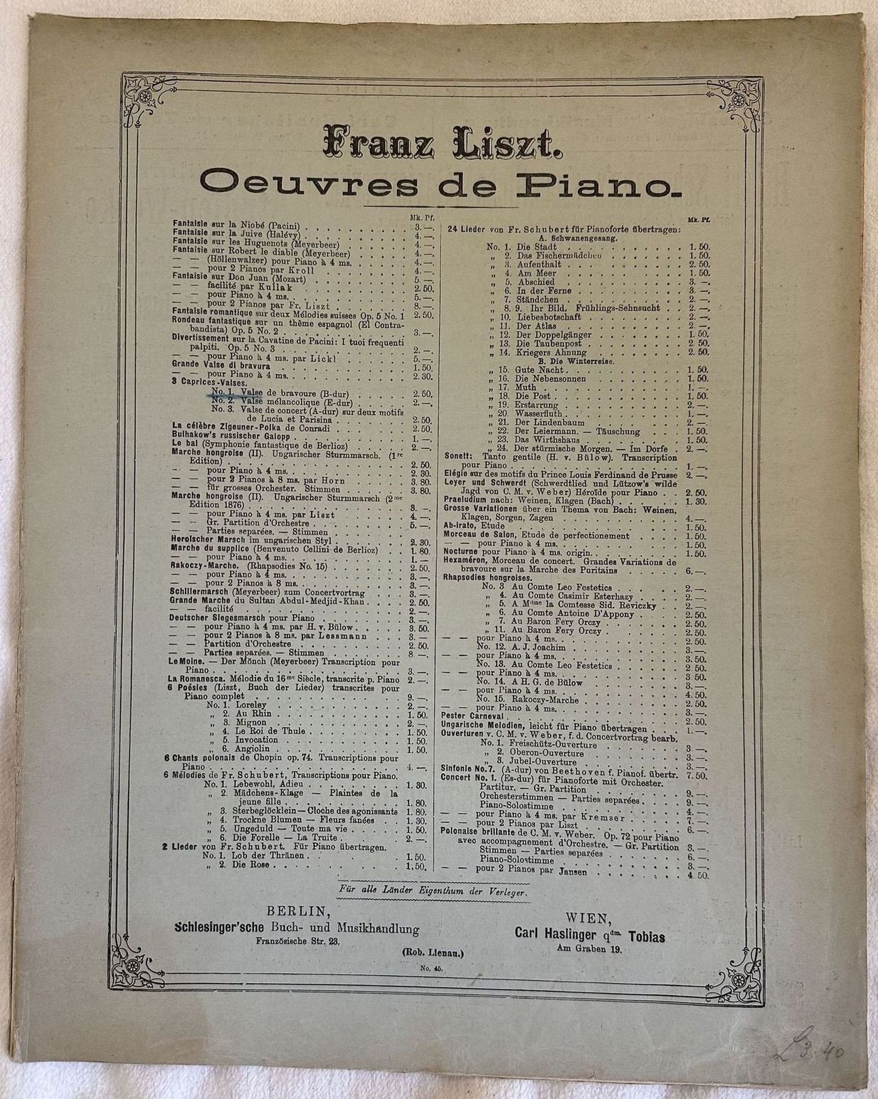 Edizione della fine dell'ottocento della melodia "Valse de Bravoure" dall'opera "3 caprices-valses" di Franz Liszt (1811-1886) di pianoforte. Decorazioni in copertina. In ottime condizioni. Copertina editoriale in buone condizioni con lievi usure marginali. Legatura editorialmente assente. Pagine in buone condizioni con rare fioriture. In Folio. cm. 34,5x27,5. Pp. 19.Edition of late 19th century of the melody "Valse de Bravoure" fromt he opera "3 caprices-valses" by Franz Liszt (1811-1886). Decorations in the cover. In very good conditions. Editorial cover in good conditions lightly worn in the extremities. Binding editoriarly lacks. Pages in good conditions with occasional foxing. In Folio. cm. 34x27,5. Pp. 19.