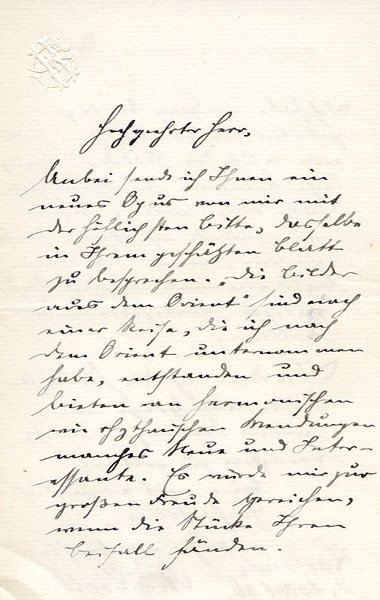 Zusammen 5 SS. auf 5 Bll. 8vo. An einen namentlich nicht genannten Adressaten: "Anbei sende ich Ihnen ein neues Opus von mir mit der höflichsten Bitte, dasselbe in Ihrem geschätzten Blatt zu besprechen. 'Die Bilder aus dem Orient' sind nach einer Reise, die ich nach dem Orient unternommen habe, entstanden und bieten an harmonischen wie rhythmischen Wendungen manches Neue und Interessante [.]" (a. d. Br. v. 20. X. 1896; ohne das erwähnte Opus). - "Nehmen Sie meinen besten Dank für Ihre gütigen Bemühungen um mein op. 12 und für die Übersendung der Kritik [.]" (a. d. Br. v. 8. XI. 1896; auf Briefpapier mit gepr. Monogramm). - "Sie erhalten anbei zwei kleine Clavierstücke, die ich für die Musikbeilage der musikalischen Presse geschrieben habe. Ich hoffe dieselben werden Ihnen convenieren. Stücke in freier Form wollte ich nicht geben und habe daher um etwas 'Kunst' zu verwenden die Kleinigkeiten in Canonform geschrieben [.]" (a. d. Br. v. 24. XI. 1896; ohne die erwähnten Stücke). - Krehl begann seine pädagogische Wirksamkeit 1889 am Konservatorium in Karlsruhe; seit 1902 war er (anfangs als Mitglied des Studien-Rates, später als Professor und Direktor) an dem in Leipzig tätig, wo er bis zu seinem Tod als Musikerzieher wirkte. Seine Kompositionen "weisen ihren Schöpfer als satztechnischen, dem Schaffen von Brahms zuneigenden Meister aus. Ein gewisser Mangel an Ursprünglichkeit in der Erfindung wird durch hervorragende handwerkliche Durcharbeitung ausgeglichen" (MGG VII, s. v.). Besonders großen Einfluß hatte er als Theoretiker: Seine mehrfach aufgelegten Lehrbücher gehören bis heute zu den Standardwerken der Musiktheorie, so etwa die "Allgemeine Musiklehre". Sein kompositorisches Schaffen umfaßt rund 30 Werke für Klavier, Violine und Klarinette.