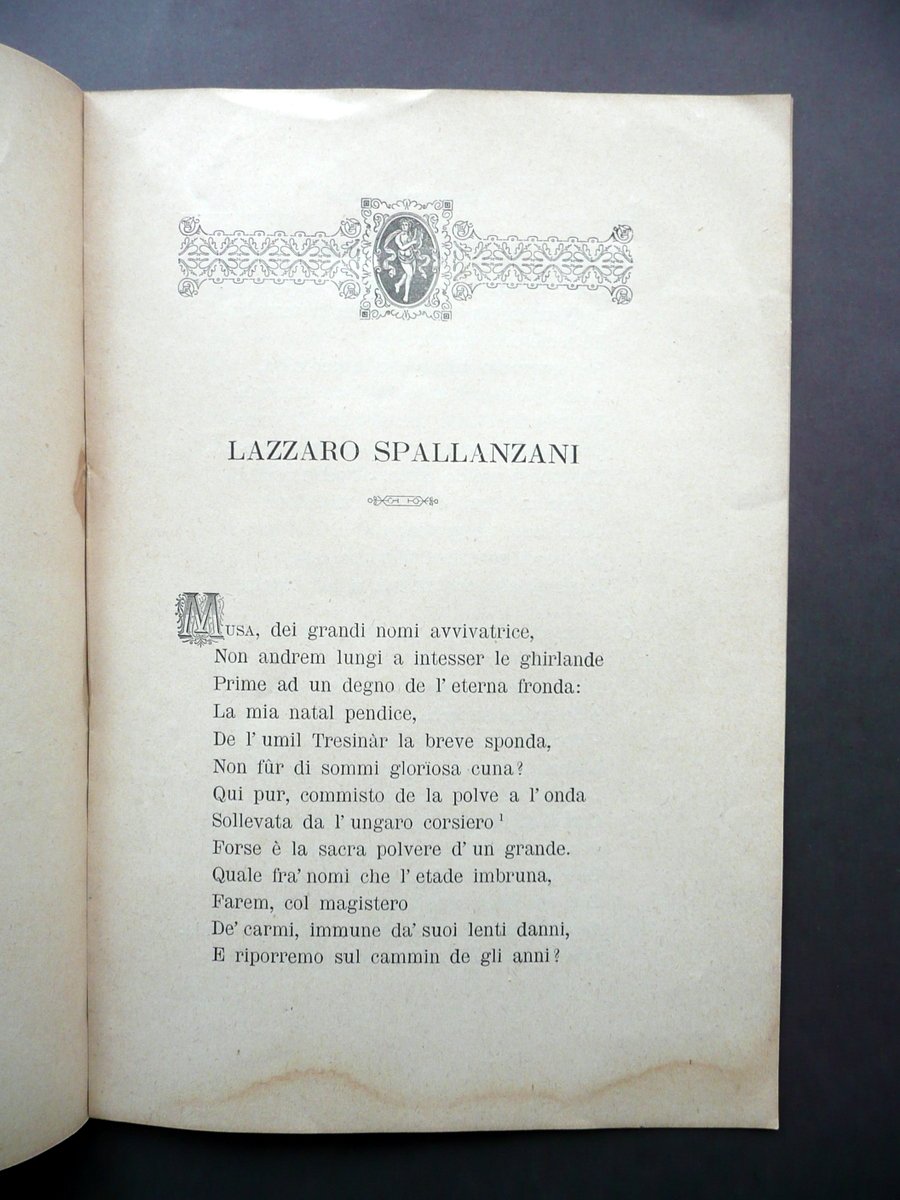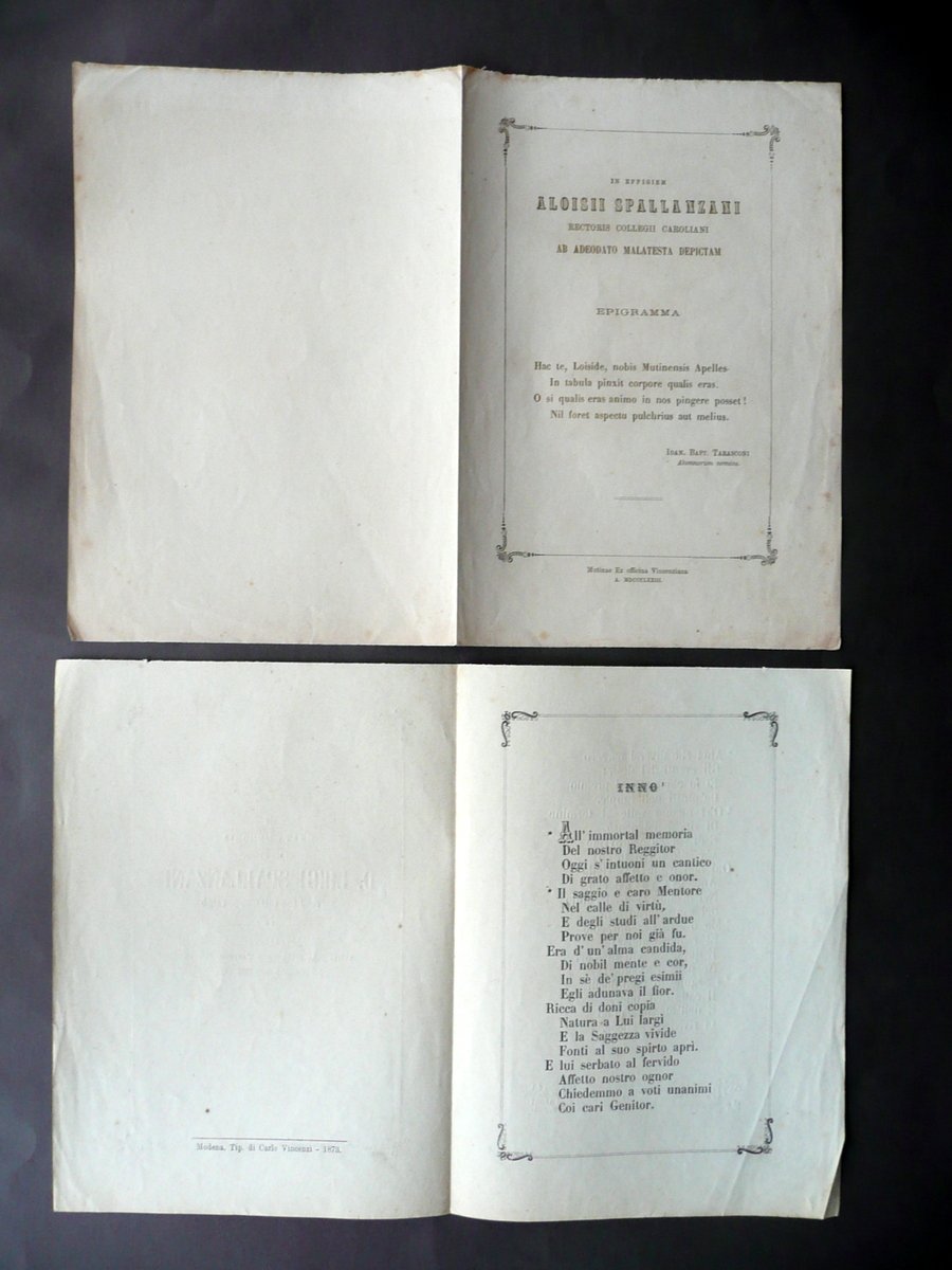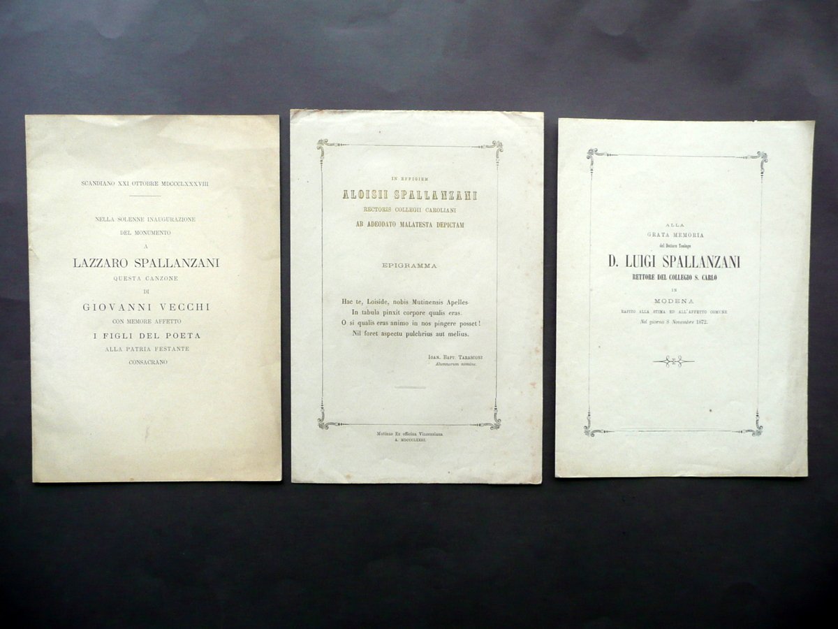 Tre opuscoli, Nella solenne inaugurazione del monumento a Lazzaro Spallanzani Questa canzone di Giovanni Vecchi [.]" - "In effigem Aloisii Spallanzani Rectoris Collegii Caroliani ab Adeodato Malatesta Depictam Epigramma [.]" - "Alla grata memoria del Dottore Teologo D. Luigi Spallanzani Rettore del Collegio S. Carlo in Modena [.]" Modena, 1873-88; tre brevi opuscoli commemorativi, dedicati a tre diversi membri della famiglia Spallanzani; uno è di pp. 8 (Lazzaro Spallanzani), due senza numeraz. di pagine (entrambi bifoli di pp. 4; vedi foto). Cm circa 23,5x16,5. Testo dell'opuscolo dedicato ad Aloisio Spallanzani in latino. Condizioni di conservazione Opuscoli tutti e tre ben conservati con tracce d'uso, qualche minima brunitura e alcuni lievissimi accenni di sporco; interni dell'opuscolo dedicato a L. Spallanzani con una leggera ombra di gora al margine inf., la quale non coinvolge il testo. SC03.D12156 N "