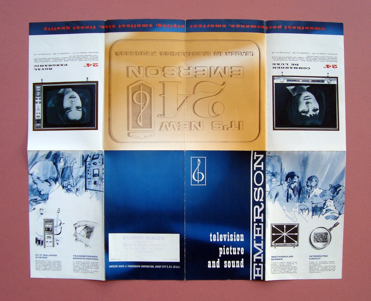 Tre Pieghevoli, Emerson" Frigoriferi television picture and sound Milano,s.d. (fine anni'50 - inizio anni '60); 2 fogli sciolti cm 31x21; un pieghevole cm 19,5x 12 (chiuso) cm ,39x48 (aperto) pieghevole pubblicitario illustrato a colori. Timbro del rivenditore in ogni esemplare. Condizioni di conservazione. Esemplari in buone condizioni con leggere tracce del tempo; i 2 fogli sciolti con piccoli strappetti ai margini. SC03.D18170 blu "