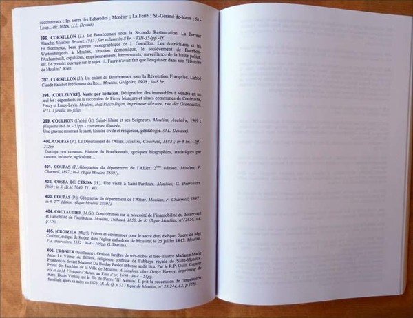 Un volume broché de format in 8° de 29 pp.; et environ 180 pp. décrivant 1185 N° de livres édités en Bourbonnais. 11 reproductions de pages de titre anciennes. Souvent les notices sont très documentées. Comme neuf. Peu fréquent.