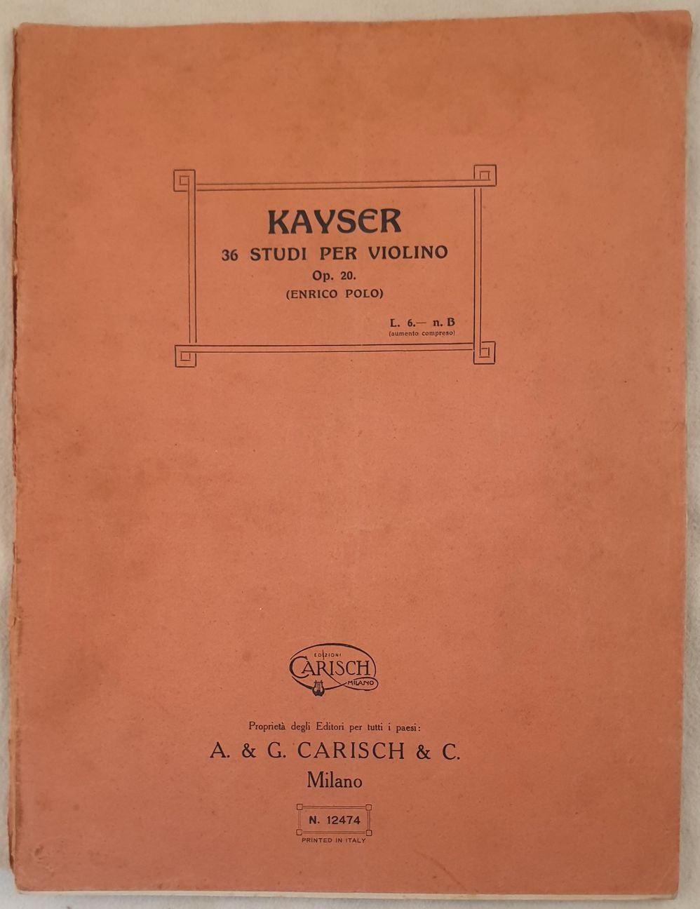 Edizione degli anni '30 di 36 studi elementari e progressivi per violino dall'opera 20 di H. E. Kayser come introduzione a quelli di Kreutzer.<BR><BR>Note manoscritte.<BR><BR>In discrete condizioni. <BR>Brossura editoriale in discrete condizioni generali con lievi usure e strappi ai margini e dorso. Piatto anteriore staccato. Legatura in mediocri condizioni con rotture. All'interno le pagine si presentano in buone condizioni con rare fioriture. In folio. Dim. 31,5x24 cm. Pp. 51. musical score of 1930's of 36 elementary and progressive studies for violin from work 20 by H. E. Kayser as an introduction to those of Kreutzer.<BR><BR>Handwritten notes.<BR><BR>In fair conditions. <BR>Editorial cover in fair general conditions slightly worn with tears in the edges and spine. Front plate is detached. Binding in poor conditions with cracks. Inside pages are in good conditions with occasional foxings. In folio. Dim. 31,5x24 cm. Pp. 51.