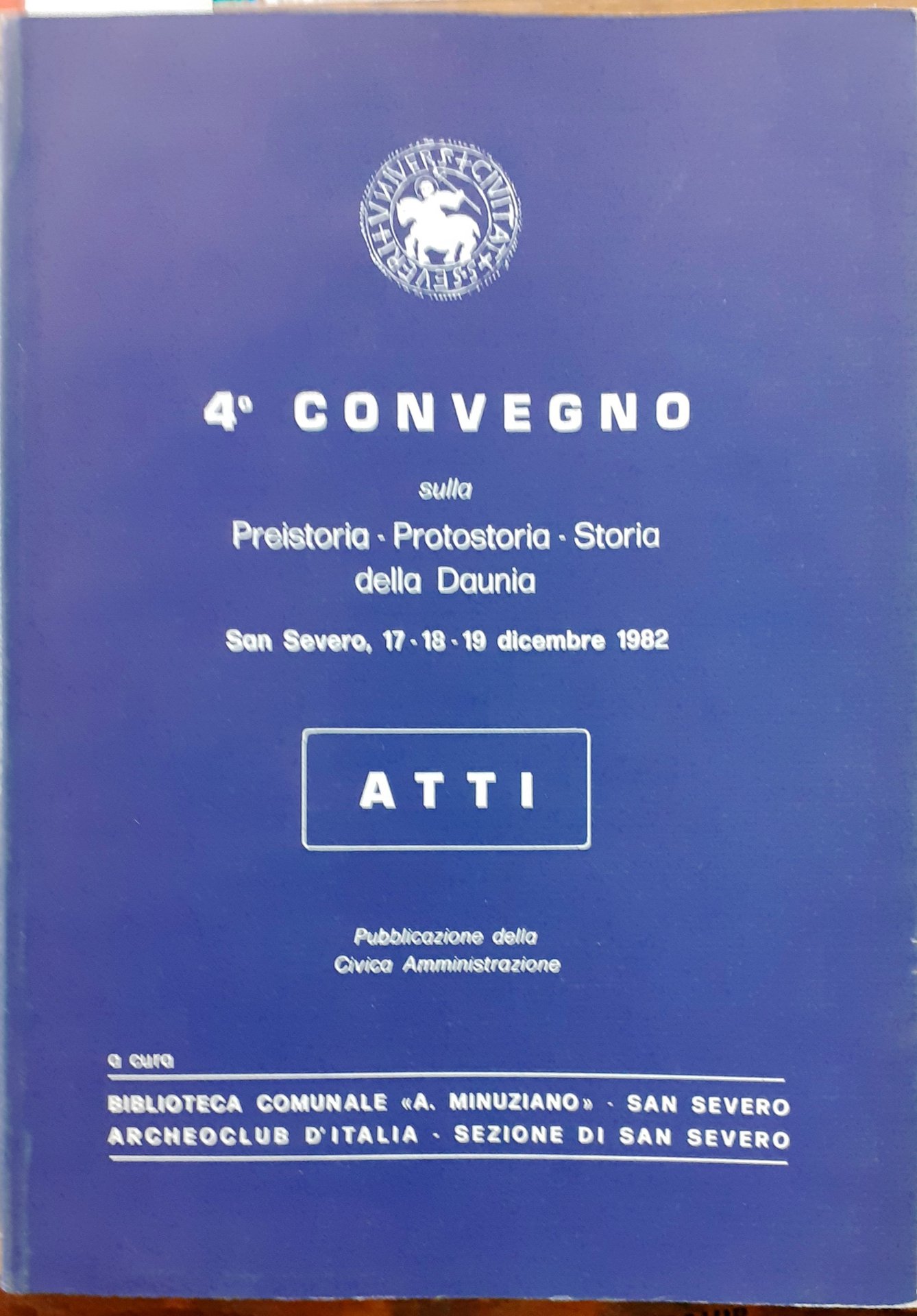 4° CONVEGNO SULLA PREISTORIA - PROTOSTORIA - STORIA DELLA DAUNIA. San Severo, 17-18-19 dicembre 1982. ATTI. Pubblicazione della Civica Amministrazione. A cura Biblioteca Comunale "A. Minuziano" - San Severo, Archeoclub d'Italia.