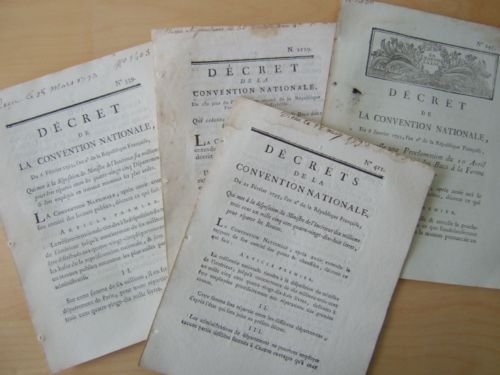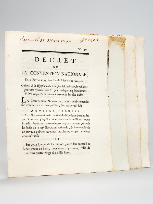 [ 4 décrets de la Révolution Française sur des travaux d’aménagement et les transports ] Décret de la Convention Nationale du 13e jour de Pluviôse, an second e la République Française, une & indivisible , Qui orone une coupe extraordinaire de Bois dans les Forêts de la République. ( N° 2129 ) ; Décret de la Convention Nationale, du 6 Février 1793, l’an 2e de la République Française, Qui met à la disposition du Ministre de l’Intérieur six millions, pour être répartis entre les quatre-vingt cinq Départemens, & être employés en travaux reconnus les plus utiles. (N° 339 ) ; Décret sde la Convention Nationale, du 22 Février 1793, l’an 2e de la République Française, Qui met à la disposition du Ministre de l’Intérieur dix millions trois cent un