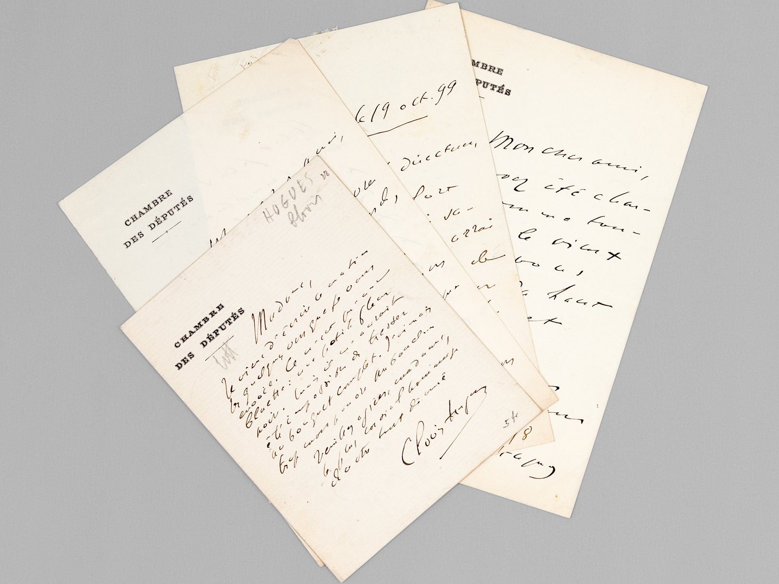 4 L.A.S. dont une datée d'octobre 1899 et une C.D.V. avec 16 lignes autographes Petit lot de 5 documents autographes signés du poète occitan (Majoral du Félibrige) et député Clovis Hugues (1851-1907).
