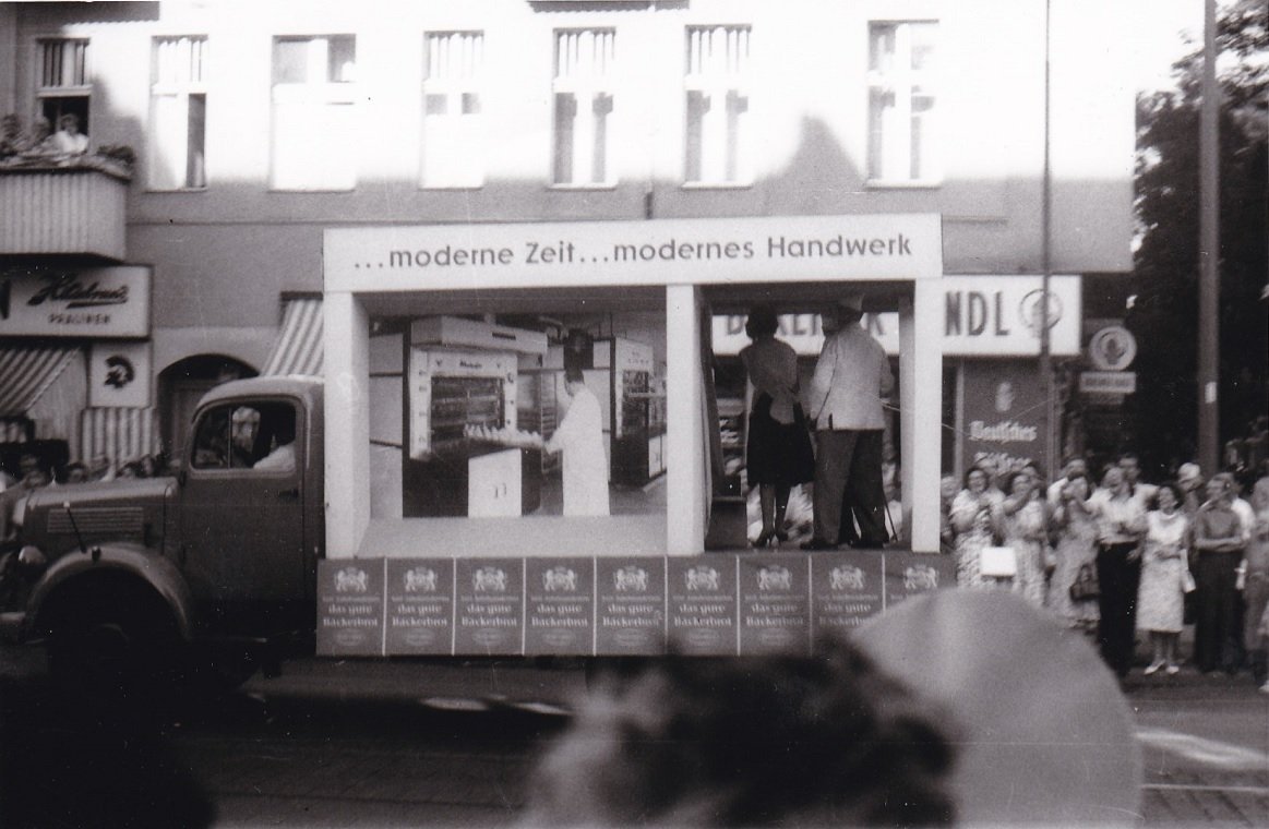 Die vier Photographien (schwarz/weiss, mit weißem Rand) zeigen einen unter dem Motto: "1360 - 1960 / . moderne Zeit . modernes Handwerk" umdekorierten Lastwagen der Firma Bäcker-Einkauf Neukölln (Britzer Damm 74). Die Aufnahmen liegen in zwei verschiedenen Größen vor: ca. 9,6 x 13,5 cm / ca. 12,7 x 13 cm. Die ersten zwei Aufnahmen zeigen den Wagen noch ohne Begleitung auf einem Hinterhof stehend, die anderen beiden zeigen ihn dann voll besetzt als Teil des Festumzugs durch die Neuköllner Hauptstraßen. Die Gestaltung des Umzugswagens zeigt hier anhand großer Tafeln die damals aktuelle Arbeitsweise im Handwerk mit großen, modernen Backöfen. Sehr wahrscheinlich handelte es sich hier um die Festivitäten zu 600 Jahren Rixdorf im Jahr 1960. Hier hatte sich scheinbar auch das Handwerk des einstigen Dorfes Rixdorf präsentiert. Die Photographien stammen aus dem Nachlaß des Berliner Gebrauchsgrafikers Werner Gruschke. Er hatte diese auf Karton montiert und in seinem Portfolio-Ordner abgelegt. Mit hoher Wahrscheinlichkeit war Gruschke zeitgenössisch an der Gestaltung des Festwagens und / oder an der Aufnahme der Photographien beteiligt. Historische Photographien aus der Rixdorfer und Berliner Stadtgeschichte aus dem Jahr 1960!
