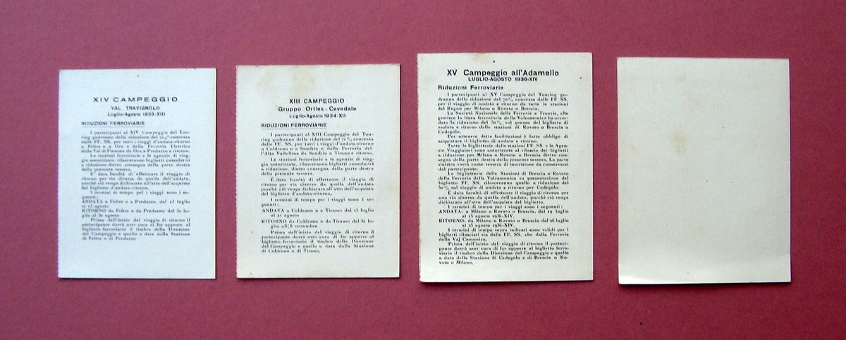 4 Tessere TCI Campeggio Adamello 1936 Ortles 1934 Travignolo 1935 Tre Cime 1938