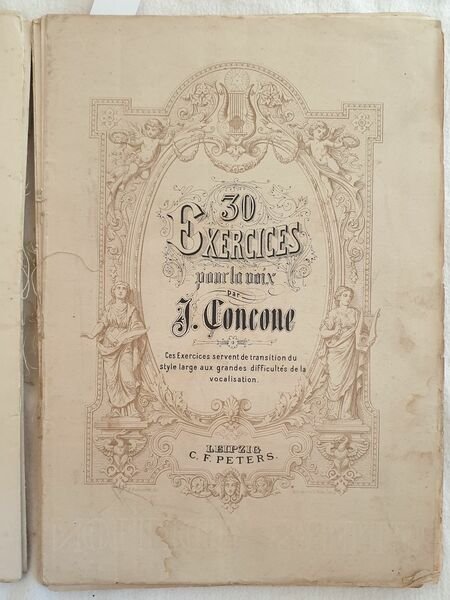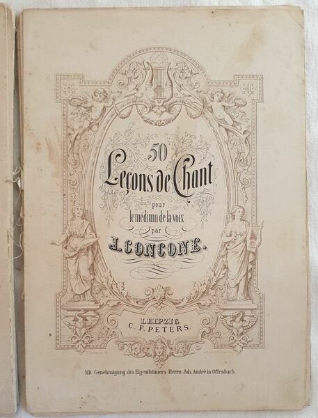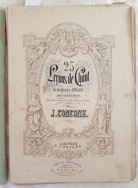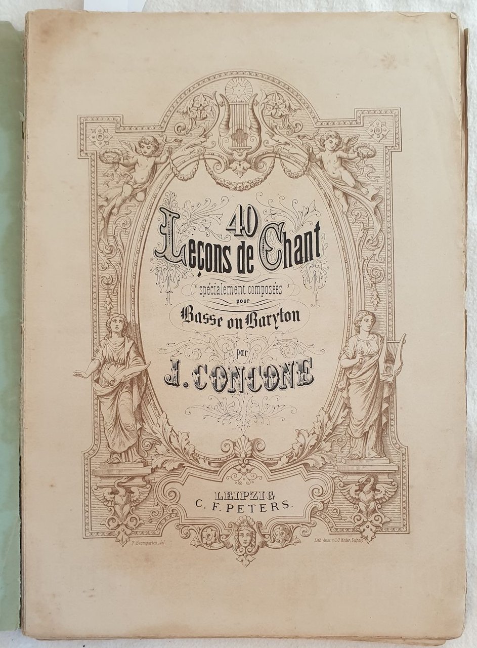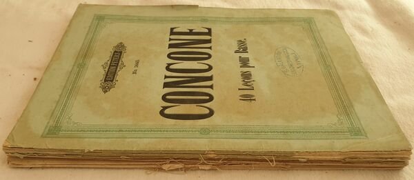 Edizione della fine dell'ottocento delle lezioni di canto di Giuseppe Concone (1801-1861). Siamo in possesso di cinque volumi: 40 lezioni per basso o baritono, 25 lezioni di media difficolta, 50 lezioni di canto, 15 vocalizzi per sorpano o mezzo soprano e 30 esercizi per la voce (pagine fino a 16 solamente, le altre mancanti) In mediocri condizioni con rare fioriture. Copertina assente, presente solo nelle 40 lezioni ma piatto anteriore staccato. Legatura quasi assente. Pagine in buone condizioni con fioriture. Nel volume 30 esercizi sono presenti solo le prime 16 pagine, le altre mancanti. Formato cm. 28x19,5. Pp. 83, 51, 87, 43, 16.Edition of late 19th century of the lessons of chants by Giuseppe Concone (1801-1861). We only have five volumes: 40 lessons for bass and barytone, 25 lessons of medium difficulty, 50 lessons of chant, 15 for soprano 30 exercises for voice (pages until 16 only, the others are missing) In poor conditions with occasional foxings. Copver is missing, there is only in 40 lessons but front plate is detached. Binding is almost missing. Pages in good conditions with foxings. In volume 30 exercises there are only the first 16 pages, the others are missing. Size cm. 28x19,5. Pp. 83, 51, 87, 43, 16.