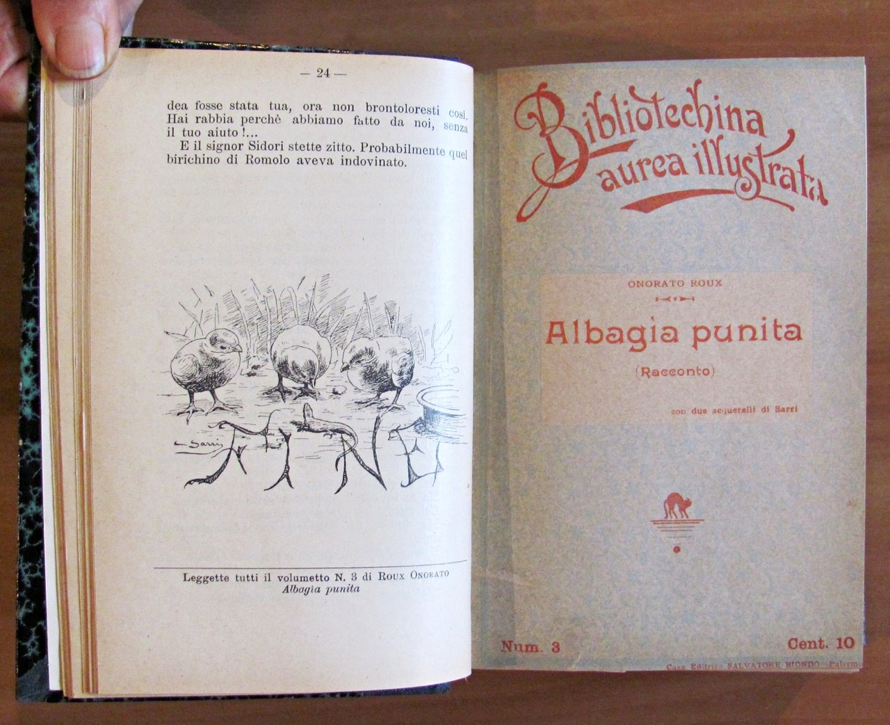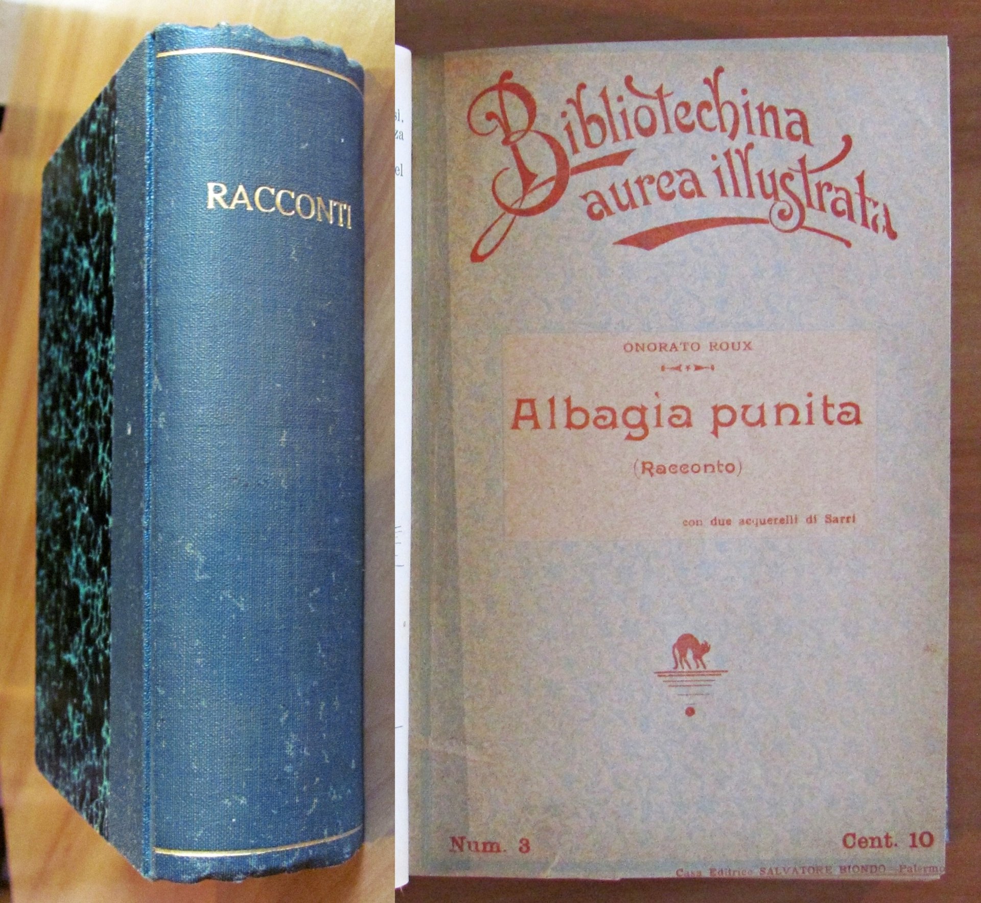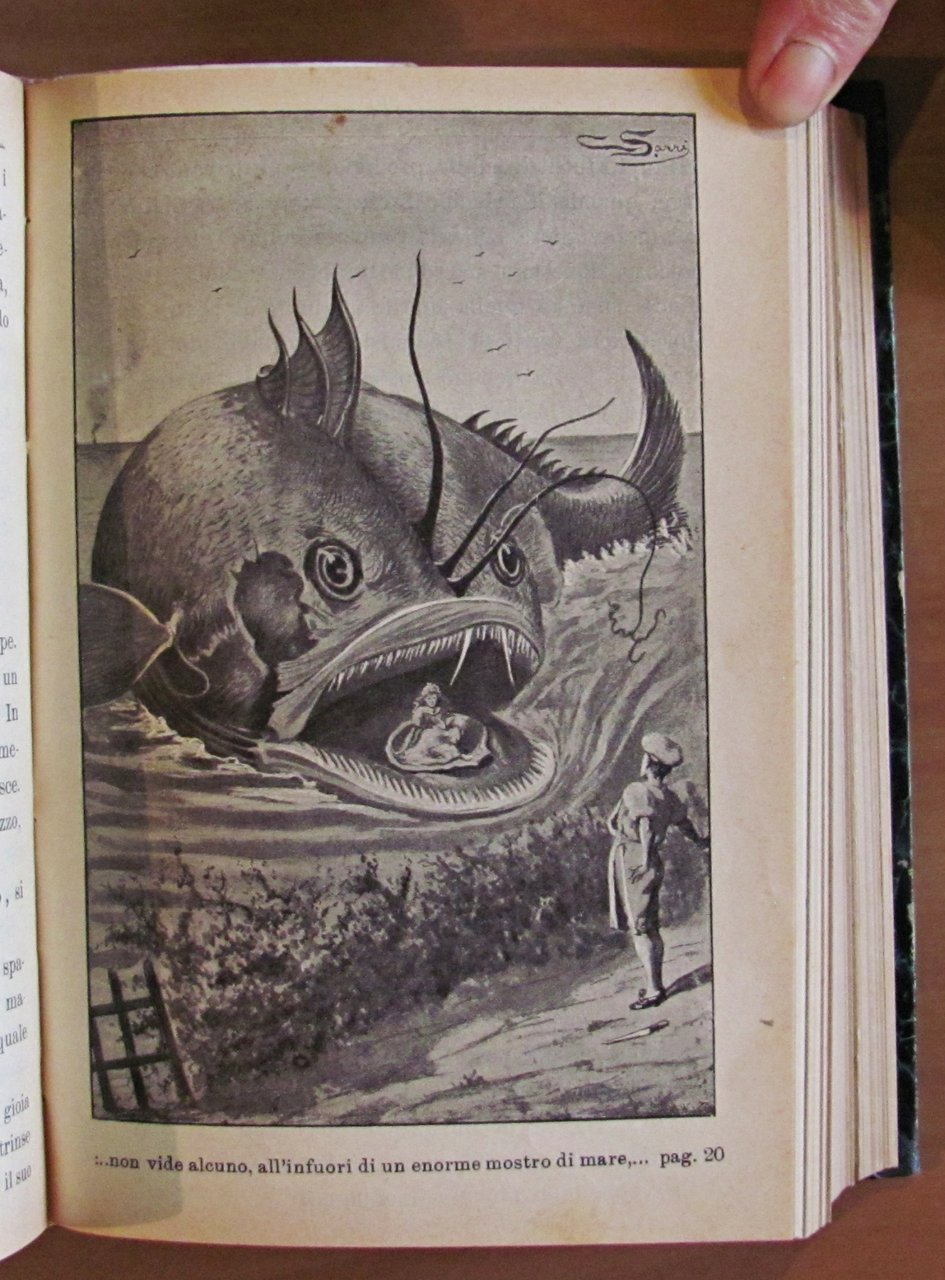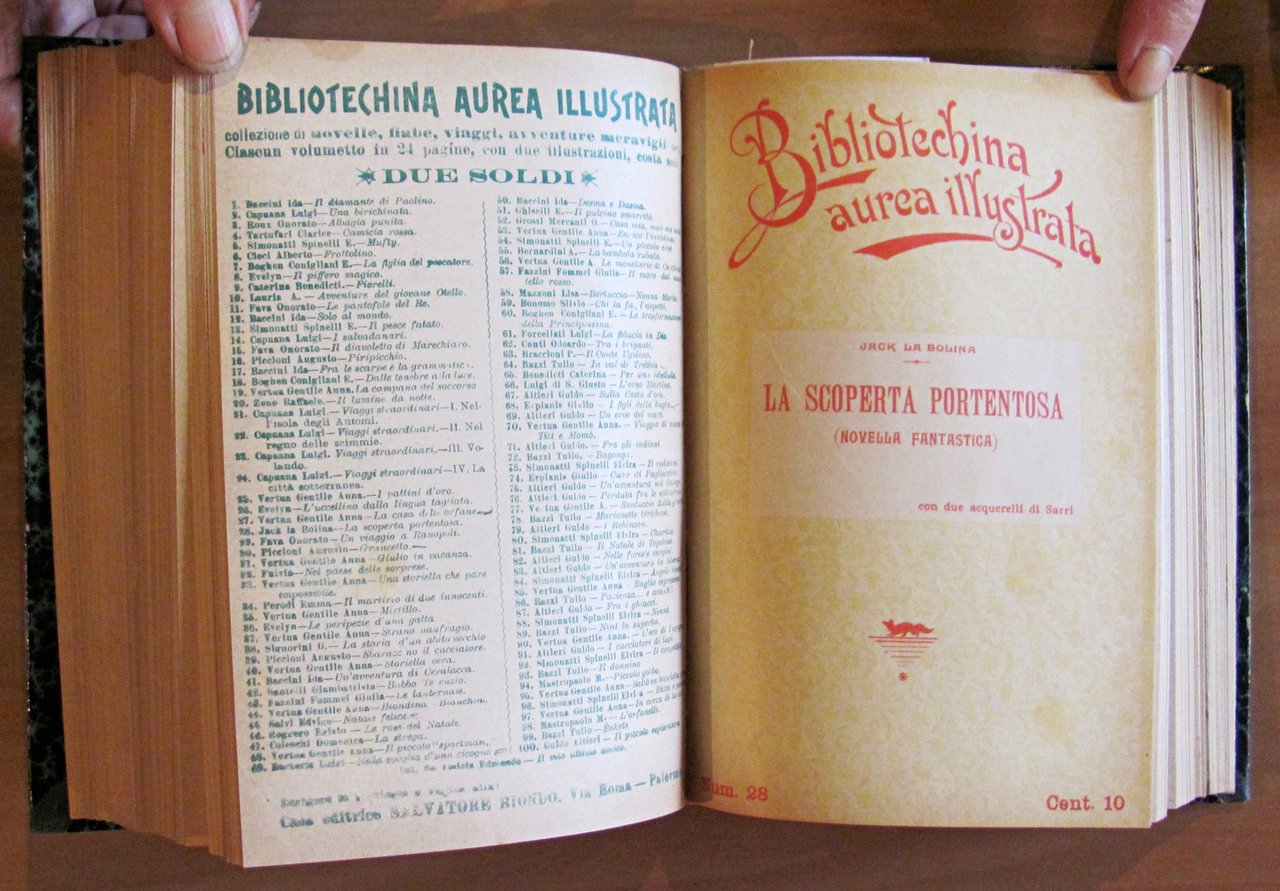 Dono in premio della buona condotta e profitto nello studio. Contiene i N.: 1/41 (-N.5) + 70, 71 e 72 di cui molti a carattere fantastico. Molte illustrazioni in b/n n.t., anche a piena pagina, di Corrado Sarri. Ed. Salvatore Biondo - Palermo, 1901-1902. Rilegatura coeva. Alcuni fascicoli sono privi di copertina o di retrocopertina. Mancanza alla retrocopertina del fascicolo N.71 (tutto come da foto). 13,5x18,5. Raro e in Ottimo stato. , Ottimo (Fine)