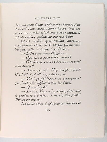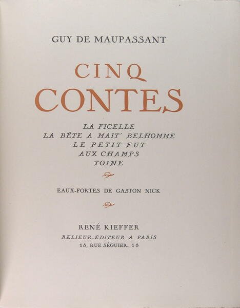 René Kiffer, Relieur-Editeur, 1928, belle in/4 broché, couverture rempliée, 107 pages. Exemplaire numéroté, 445/450. 20 eaux-fortes en noir de Gaston Nick. La ficelle - La bête à Mait' Belhomme - Le petit fût - Aux champs - Toine.