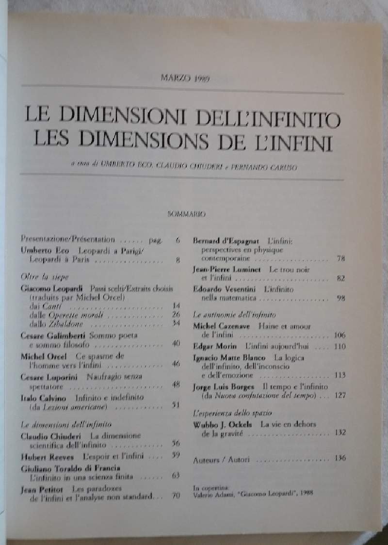 In 8' gr., br. ed. pp. 134, ill. in n. n.t., "Le dimensioni dell'infinito- Les dimensions de l'infini", bilingue; in buono stato, ordinari segni d'uso e del tempo. ***Due to bureaucratic reasons, books dated over 70 years old cannot be immediately exported, please contact us before placing the order.***