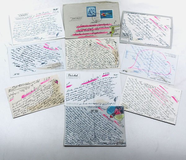 Ca. 26 SS. auf 19 Bll. Folio und qu.-8vo. Mit 16 eh. adr. Kuverts und 19 Beilagen (s. u.). Eine Sammlung von sehr ausführlichen, vertrauten und humorvollen Schreiben an eine Brigitte Schalk, alle geschrieben in der Strafanstalt Graz-Karlau, wo Proksch seit 1992 seine Haftstrafe wegen sechsfachen Mordes im Fall Lucona verbüßte. Einige der Briefe sind mit Edelweiß, abgeschnittenen Barthaaren u. a. ausgestaltet. - Zu den Beilagen gehören neun von Proksch auf der Verso-Seite mit Post-it markierte und beschriebene Privataufnahmen (teils original und teils spätere Abzüge von Originalen), die u. a. Udo und Rüdiger Proksch daheim in Rostock zeigen, Udo als Schüler der NAPOLA und als Studenten der Akademie für angewandte Kunst, und Proksch erste Gattin Erika Pluhar samt der gemeinsamen, damals etwa dreijährigen Tochter Anna. - Unter den sonstigen Beilagen finden sich zwei rückseitig bezeichnete Postkarten, ein Papieretui mit einem Edelweiß, eine mit Kugelschreiber und Farbstift ausgeführte, recht assoziativ anmutende Zeichnung, ein rund um einen Computerausdruck geschriebener Brief, in dessen Mitte Proksch zusammen mit Helmut Qualtinger als Eulensammler zu sehen ist, sowie zwei originelle, von Proksch knapp kommentierte pornographische Ausschnitte.