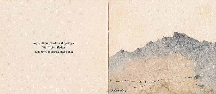 Die insgesamt sechs Photographien entstammen dem großen Fest für den bedeutenden Verleger Wolf Jobst Siedler am 25. Januar 1986. Siedler war seit Anfang der 1960er Jahre als konservativ-kritischer Journalist, Essayist und Verleger in Westberlin tätig. Insbesondere seine verlegerische Tätigkeit im eigenen Siedler Verlag machte ihn für viele Menschen in der BRD zu einem bedeutenden Zeitgenossen. Im Januar 1986 feierte Siedler seinen 60. Geburtstag, mit Würdigungen in allen wichtigen Medien der westdeutschen Öffentlichkeit. Die Verlagsgruppe Bertelsmann lud für Sonnabend den 25.01.1986 zu einem Abendessen, Ort des Empfangs war das damalige Ägyptische Museum in West-Berlin (Östlicher Stülerbau, Schloßstraße). Für den Empfang zu Ehren des zeitgenössisch bedeutenden Verlegers wurde eine lange Tafel durch den ganzen Saal vorbereitet, desweiteren ca. 8-10 Rundtische für mehrere Personen. Unter den Gästen waren zahlreiche Kollegen aus Verlagen und Journalismus, West-Berliner und bundesdeutsche Politiker, Publizisten und Wissenschaftler, welche zeitgenössisch - für die westdeutsche Öffentlichkeit vor Ende des Kalten Krieges und der deutschen Wiedervereinigung - von eminenter Bedeutung waren. Auch ein Blick auf die Sitzordnung für den Abend ist überaus reizvoll: denn rechts neben dem konservativen Verleger saß der ehemalige Bundeskanzler Willy Brandt, links von ihm der wohl gewichtigste Bankier der alten Bundesrepublik Hermann Abs. An der langen Tafel saßen die berühmten Verlegerkollegen nebeneinander. Hier waren Siegfried Unseld, Ernst Klett und Heinrich Maria Ledig-Rowohlt dicht beieinander. Die sechs Original-Photographien zeigen Wolf Jobst Siedler in Ansichten mit meist einer anderen Persönlichkeit, entweder im Gespräch oder mit Blick in Richtung Kamera. Beide Gesprächspartner stehen jeweils im Zentrum der Aufnahme, Kopf und Oberkörper sind gut zu sehen. Die sechs Aufnahmen zeigen Siedler jeweils allein mit Siegfried Unseld, Günter Gaus, Bruno Kreisky, Eberhard Diepgen, Hermann Abs und zuletzt in einer Reihe mit Joachim Fest, Hermann Abs und Eberhard Diepgen. Den Photographien wurde beigefügt die einstige Menükarte (Einband) mit einem Aquarell von Ferdinand Springer. Rückseitig ist hier zu lesen: "Aquarell von Ferdinand Springer / Wolf Jobst Siedler zum 60. Geburtstag zugeeignet". Hier werden Verbindungen zwischen dem konservativen Verleger und den Größen in Politik, Wirtschaft, Verlagswesen und Publizistik augenscheinlich. Sehr interessantes Photographien-Konvolut mit Einblicken in die Geschichte eines Verlegers und der Eliten der alten BRD!