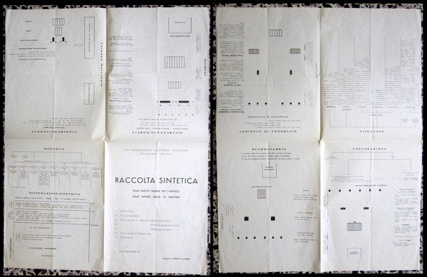 In 4°, depliant apribile di 8 facciate in cui vengono esplicate le seguenti norme in forma grafica e scritta: offensiva, esplorazione, sicurezza in marcia (Avanguardia), fiancheggiamento, retroguardia, sicurezza in stazione, difensiva; ottimo es.