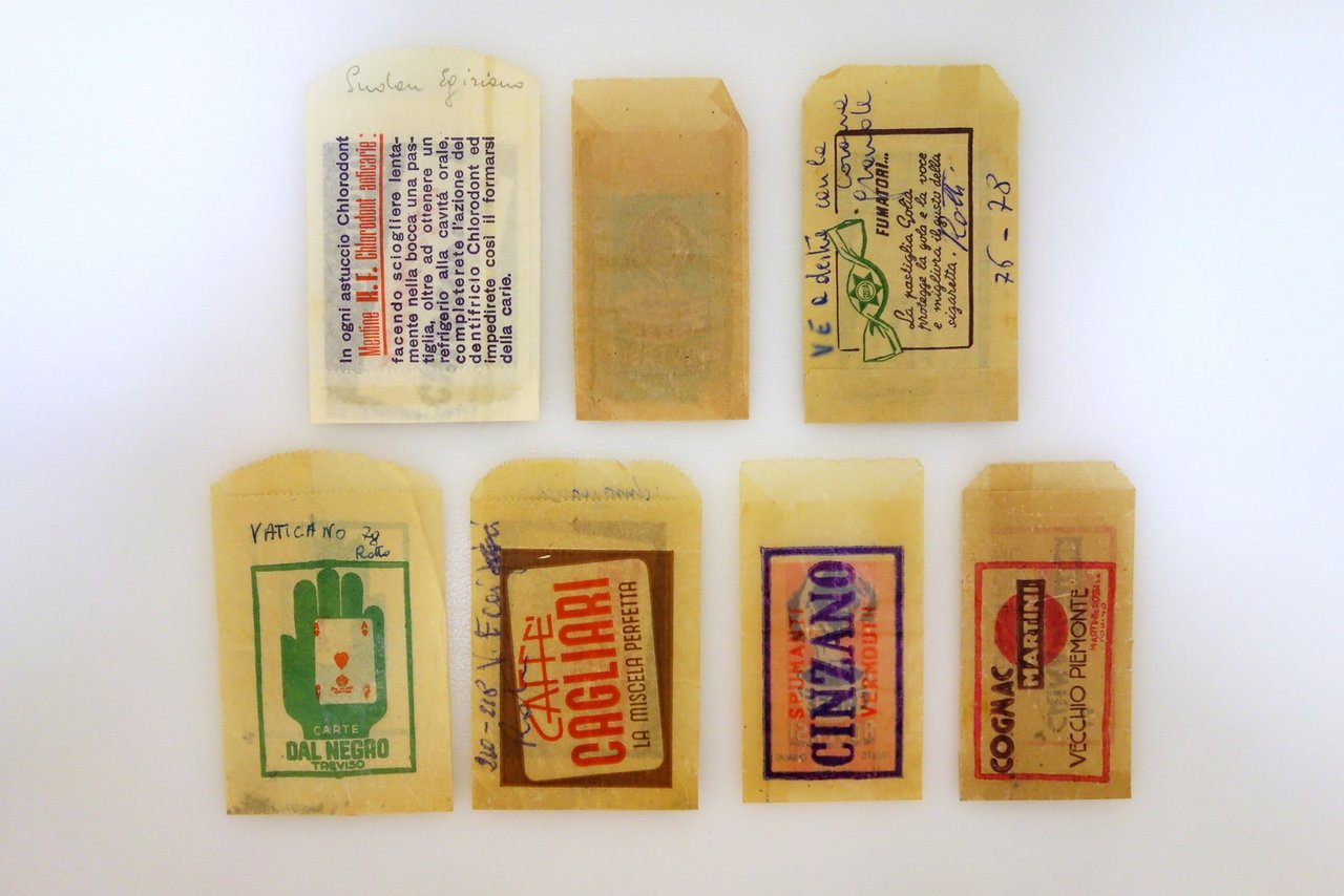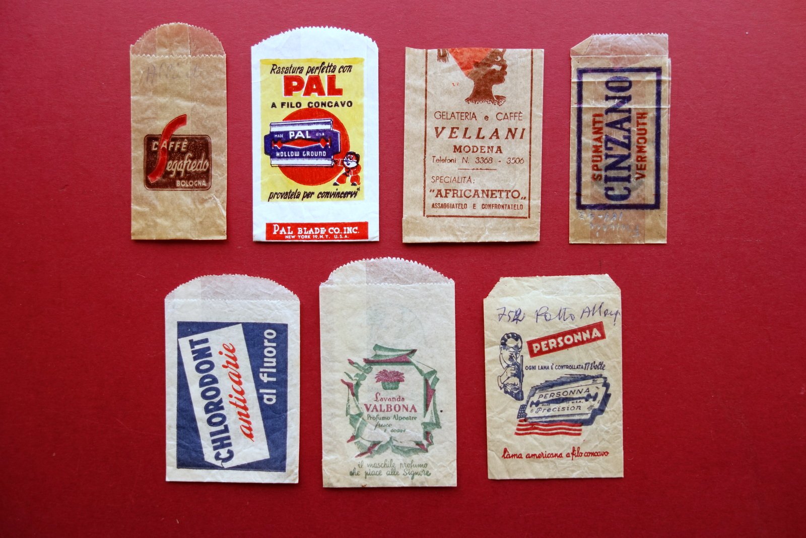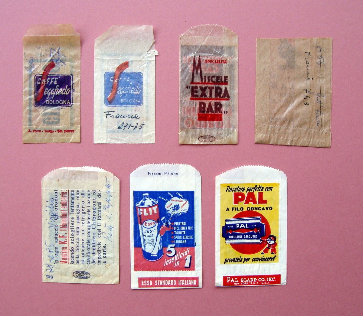 S. d. ma anni '60 del '900 circa; lotto di 7 bustine con pubblicità a colori, in uso dai tabaccai per vendita sigarette sfuse o valori bollati; dimensioni varie circa 6x10 cad.