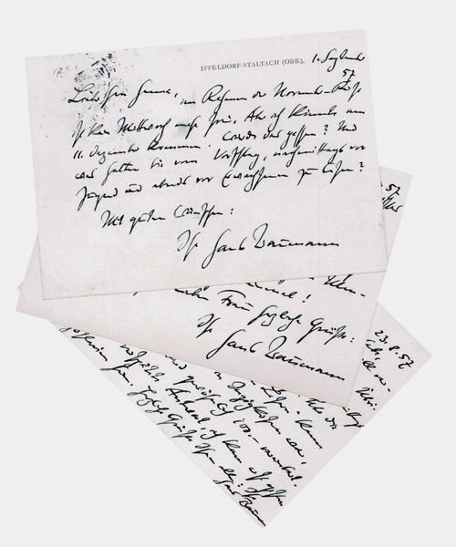 Zusammen 7 SS. auf 7 Bll. Qu.-8vo. Meist mit eh. Adresse. An den Buchhändler Willi Henne wegen Leseabenden: "Eben komme ich aus Italien zurück; dort war ich für ein neues Buch auf den Spuren der Zugvögel und des heiligen Franz. Nun möchte ich nur rasch anfragen, ob es beim Mittwoch (11. 12.), den ich auf Ihre Anfrage vom 14. 8. hin vorschlug, bleiben kann und ob lediglich eine Lesung vor Jugendlichen um 17 Uhr oder noch ein Abend mit 'großen Hörern' geplant wird. Beides ist mir recht [.]" (a. d. Karte v. 7. X. 1957). - Hans Baumann komponierte während des Dritten Reichs Fahrtenlieder und HJ-Lieder und lebte nach der Entlassung aus sowjetischer Kriegsgefangenschaft als freier Schriftsteller. Er verfaßte vor allem Kinder- und Jugendbücher sowie Abenteurerromane, „oft mit historischer Thematik, die auch international erfolgreich waren, und übersetzte aus dem Russischen“ (DBE). - Meist auf Briefpapier mit gedr. Briefkopf.