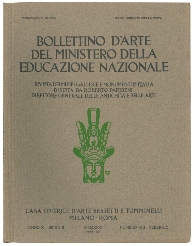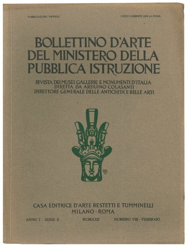 Mm. 290x226. 8 numeri di questo bollettino d'arte del ministero della educazione nazionale: 1922 (Febbraio), '23 (Settembre), '24 (Aprile), '25 (Maggio), '27 (Dicembre), '28 (Ottobre), '31 (Maggio e Febbraio). Con numerose illustrazioni. Brossura editoriale con titolo al dorso e alla copertina anteriore. Esemplari molto ben conservati.