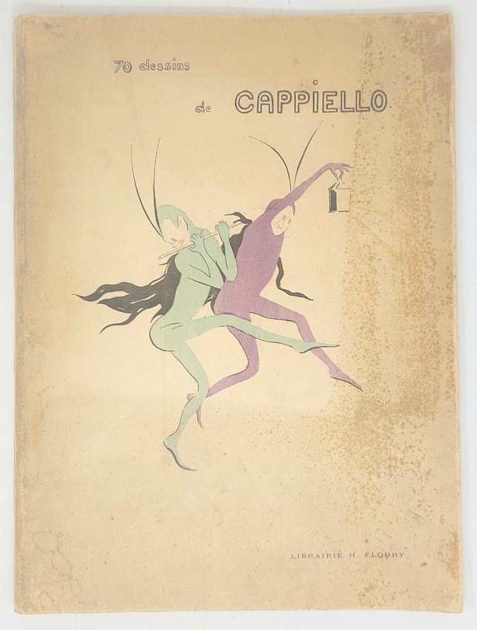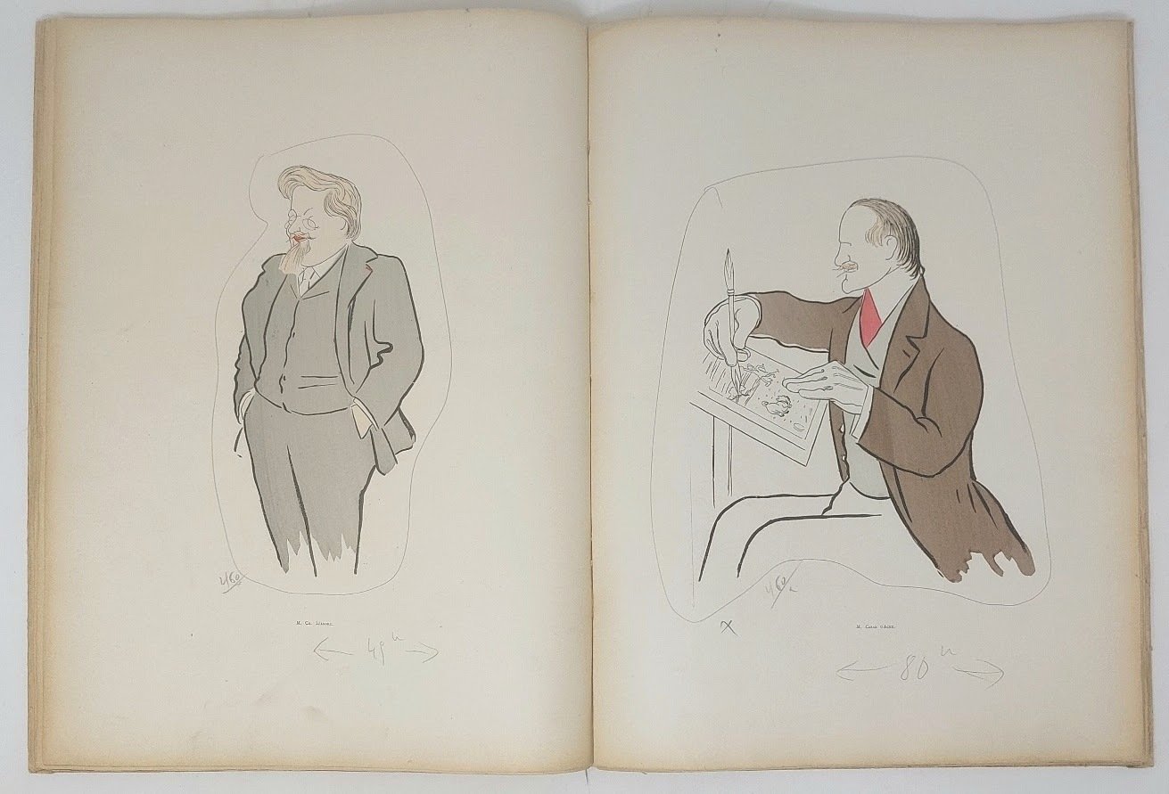 >in-folio, pp. (66) con 62 tavole a piena pagina, a colori, disegnate da Cappiello e raffiguranti Catulle Mendès, Abel Hermant, Paul Adam, Sarah Bernhardt, Marcel Prevost, Edmond Rostand, Robert de Montesquiou, Marie Leconte, Alphonse Allais, Edmond Haraucourt ed altri. Broch. edit. con sovracoperta figurata a colori sempre da Cappiello. Edizione originale, impressa in 1550 esemplari numerati (n. 854 su carta ordinaria). Modesto esemplare.