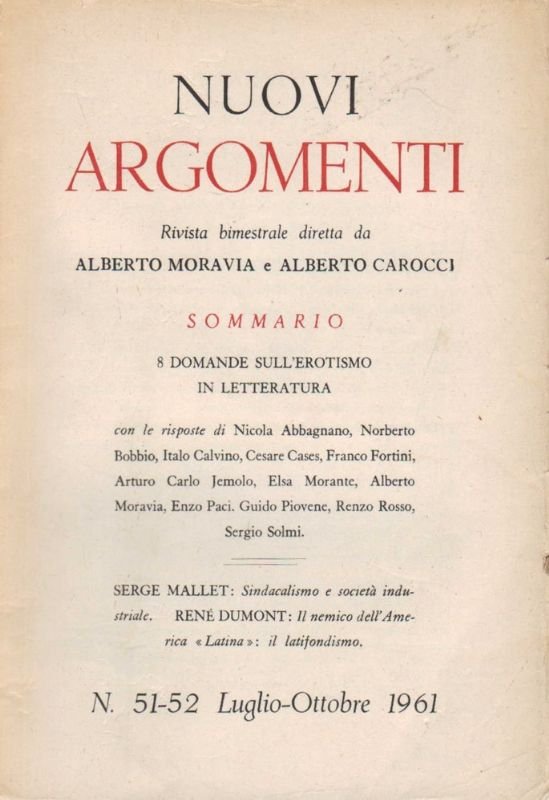 8 domande sull'erotismo in letteratura, con le risposte di Nicola Abbagnano, Norberto Bobbio, Italo Calvino, Cesare Cases, Franco Fortini, Arturo Carlo Jemolo, Elsa Morante, Alberto Moravia, Enzo Paci, Guido Piovene, Renzo Rosso, Sergio Solmi. Numero 51-52 Luglio Ottobre 1961.