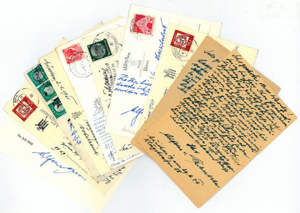 9 eigenh. (davon 7 Bild-)Postkarten mit U. und 1 gedr. Billett mit U.