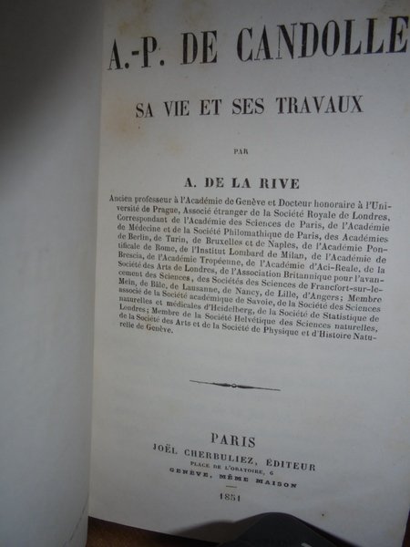 A. DE LA RIVE. Paris, Joel Cherbuliez, éditeur, 1851. A.-P. DE CANDOLLE sa Vie et ses Travaux. Edizione originale. In-16°, m.tela, dorso a nervi, fregi e titoli in oro. 311, (1) pp. Ben conservato. Neg. nat. mob. 22