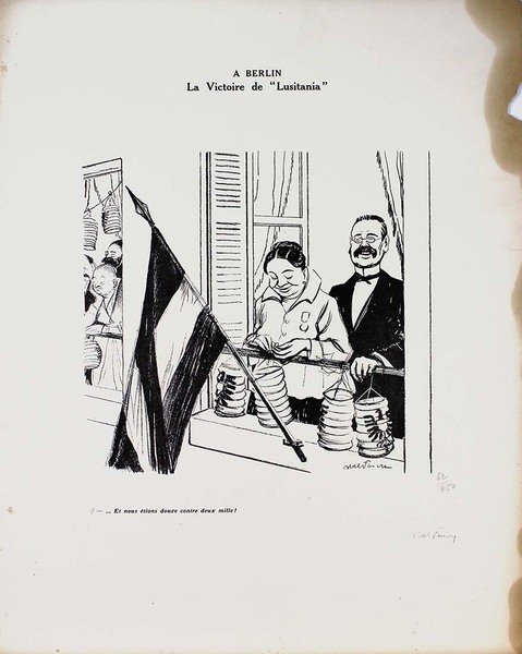 Abel Jules Faivre (Lione 1867 - Nizza 1945) Litografia originale firmata a mano dall'artista.Dimensioni: 56 x 38,5 cmCon certificato di autenticità C.O.A.Ingiallimento laterale come da foto.Esemplare numero 62/250 La raccolta di litografie umoristiche del caricaturista francese Abel Faivre (Lione 1867-Nizza 1945), andata a confluire nel volume Jours de guerre,fu pubblicata in due tomi tra il 1915 e il 1919. Con il procedere del conflitto, l'opinione pubblica di tutti i paesi coinvolti,che aveva dapprima affrontato tale evento con ottimismo, mutò rapidamente opinione sino a considerare la guerra, senza mezzi termini,come un avvenimento rovinoso. In tale contesto, le vignette satiriche di guerra possedevano un potente effetto catartico,adempivano un ruolo sociale irrinunciabile, fornendo una valvola di sfogo all’incombere dal più cupo pessimismo. Abel Jules Faivre (Lyon 1867 - Nizza 1945) Originale Lithographie vom Künstler von Hand signiert.Abmessungen: 56 x 38,5 cmMit Echtheitszertifikat C.O.A.Seitliche Vergilbung wie auf dem Foto.Kopieren Sie die Nummer 62/250 Die Sammlung humorvoller Lithographien des französischen Karikaturisten Abel Faivre (Lyon 1867-Nizza 1945), die in den Band Jours de guerre floss,es wurde zwischen 1915 und 1919 in zwei Bänden veröffentlicht. Im Verlauf des Konflikts wurde die öffentliche Meinung in allen beteiligten LändernWer dieses Ereignis anfangs mit Optimismus konfrontiert hatte, änderte schnell seine Meinung, um den Krieg ohne Zweifel zu betrachten.wie ein ruinöses Ereignis. In diesem Zusammenhang hatten die satirischen Kriegskarikaturen eine starke kathartische Wirkung.Sie erfüllten eine unverzichtbare soziale Rolle und bildeten ein Entlastungsventil gegen den dunkelsten Pessimismus. Abel Jules Faivre (Lyon 1867 - Nice 1945) Lithographie originale signée à la main par l'artiste.Dimensions: 56 x 38,5 cmAvec certificat d'authenticité C.O.A.Jaunissement latéral comme sur la photo.Copie numéro 62/250 La collection de lithographies humoristiques du caricaturiste français Abel Faivre (Lyon 1867-Nice 1945), qui allait se fondre dans le volume Jours de guerre,il a été publié en deux volumes entre 1915 et 1919. À mesure que le conflit progressait, l'opinion publique de tous les pays impliqués,qui avait d'abord fait face à cet événement avec optimisme, a rapidement changé d'avis pour envisager la guerre, en termes non équivoques,comme un événement ruineux. Dans ce contexte, les caricatures de guerre satiriques ont eu un puissant effet cathartique,ils remplissaient un rôle social indispensable, fournissant une soupape de décharge du pessimisme le plus sombre. Abel Jules Faivre (Lyon 1867 - Nice 1945) Original lithograph signed by hand by the artist.Dimensions: 56 x 38.5 cmWith certificate of authenticity C.O.A.Lateral yellowing as in the photo.Copy number 62/250 The collection of humorous lithographs by the French caricaturist Abel Faivre (Lyon 1867-Nice 1945), which went to flow into the volume Jours de guerre,it was published in two volumes between 1915 and 1919. As the conflict progressed, public opinion in all the countries involved,who had initially faced this event with optimism, quickly changed his opinion to consider the war, in no uncertain terms,like a ruinous event. In this context, the satirical war cartoons had a powerful cathartic effect,they fulfilled an indispensable social role, providing a relief valve from the darkest pessimism.