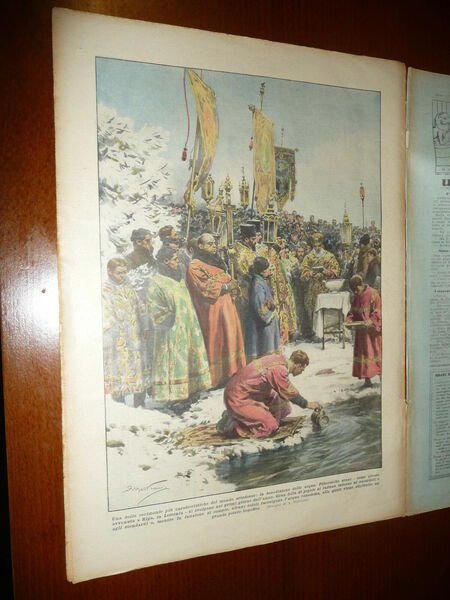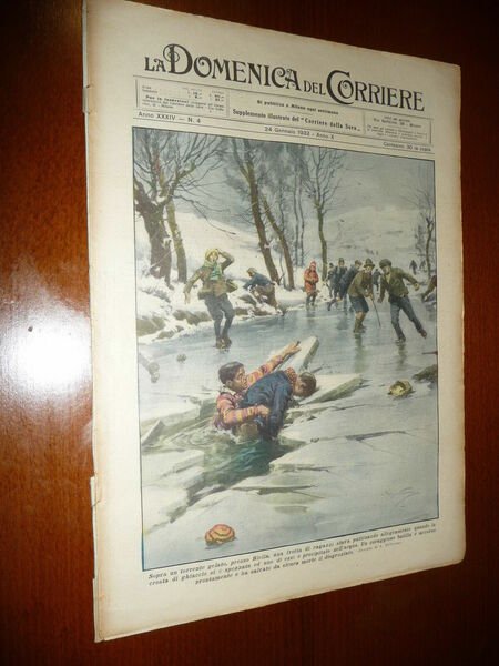 DESCRIZIONE: Domenica del Corriere, Milano, Anno 34 n. 4 (24 gennaio 1932). COPERTINA: A Biella sopra un torrente dei ragazzi stavano pattinando, quando la crosta di ghiaccio si è rotta. Un coraggioso Balilla interviene e salva lo sventurato da morte. RETRO: Una delle cerimonie più caratteristiche edel mondo ortodosso: la benedizione delle acque, a Riga in Lettonia. La Domenica del Corriere è stato un popolare settimanale italiano fondato a Milano nel 1899 e chiuso nel 1989. Apparve per la prima volta nelle edicole l'8 gennaio 1899 come supplemento illustrato del Corriere della Sera. Stampata in grande formato (sul modello del domenicale La Tribuna illustrata), aveva 12 pagine e veniva distribuita gratis agli abbonati del Corriere, oppure si poteva acquistare in edicola per 10 centesimi. La prima e ultima di copertina erano sempre disegnate. Il Corriere si avvaleva di un giovane disegnatore, Achille Beltrame, allora sconosciuto, a cui veniva affidato in ogni numero il compito di rendere con la sua tavola il fatto più interessante della settimana. Dopo la sua morte nel 1945, fu sostituito da Walter Molino che, come il suo predecessore, firmò memorabili copertine. A differenza dei settimanali dell'epoca, la Domenica del Corriere diede ampio spazio alle fotografie e ai disegni, e questo fu uno dei motivi del suo successo. CONDIZIONI: Buone con spillette, con sovracc. azzurrina. PESO / WEIGHT: 55 gr. without package.