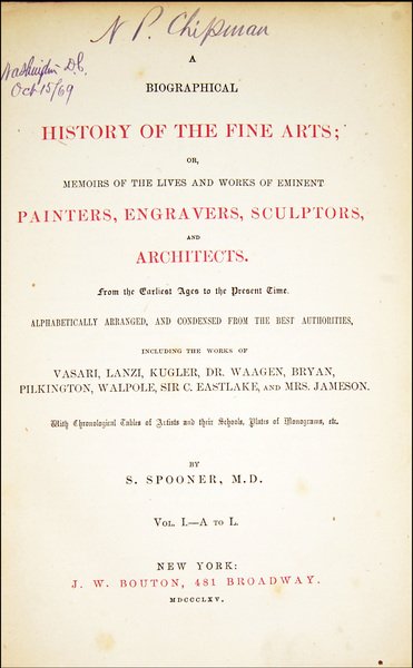 4to (258x174 mm), modern full cloth binding, gilt title at spine, marbled paper at paste-downs, gilt top edge; 2 volumes; pp. LXIII, XXIV plates, 501, [1 b.], [1], 504-1150; illustrations throughout. The work is paged continuously. Two title-pages pronted in red and black types. FINE FIRST EDITION OF THIS BIOGRAPHICAL DICTIONARY OF ARTS AND ARTISTS BY SPOONER. The work includes a list of painters, a list of artists, a list of copyists, a list of authorities, a list of artists’ monograms (24 plates) and the biographical dictionary (v. 1. A-L; v. 2. M-Z). Shearjashub Spooner (December 3, 1809 in Brandon, Vermont – March 14, 1859 in Plainfield, New Jersey) was an American physician and writer. After graduating as a physician in Middlebury in 1830 and New York City, in 1835, he became a dentist in New York. Prov.: Ownership handwritten inscription at title-pages (N. P. Chipman, Washington – D.C., Oct. 15, 1869) and large engraved labels glued at first free-leaves of both volumes (Ex libris Constantine Raphael-Bricca). Dr. Constantine Raphael-Bricca, widely known as an eye, ear, nose and throat specialist, was born in San Francisco in 1880. He was a graduate of St. Ignatius College with the degree of Bachelor of Arts, and also of the medical department of the University of California. In his special line of practice, he had extensive experience both in the East and in Europe, having studied with the master minds of this particular branch of the medical profession. Dr. Bricca was chief medical inspector of the San Francisco public schools during the last administration, having inaugurated a system of medical inspection and examination never before known in public school work. He resigned in the latter part of 1909. Dr. Bricca’s activities have not been confined to his profession. He was president of the Harlow-Bricca Company, an exclusive mail order house doing an extensive business. Ref.: This edition is not registered in ICCU. OCLC, 1723558. Cond.: Very light traces of use to the internal leaves. A fine set.