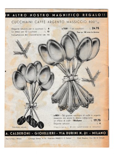 Brossura (cm 20x15) pag 15 tutte illustrate. Lieve brunitura sulla copertina. -- Servizi per la tavola, per ricamo, per toeletta, ecc. tutto in argento. Prezzi di tutti i prodotti.