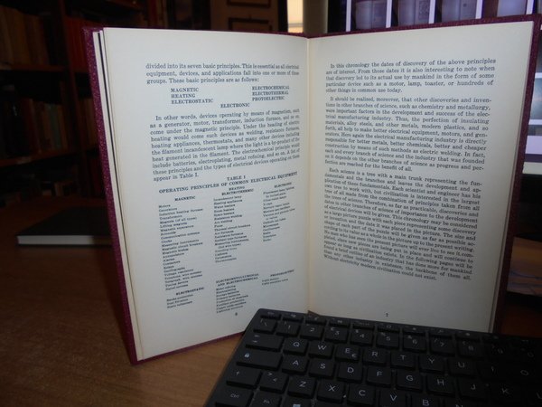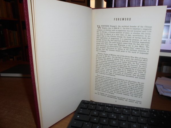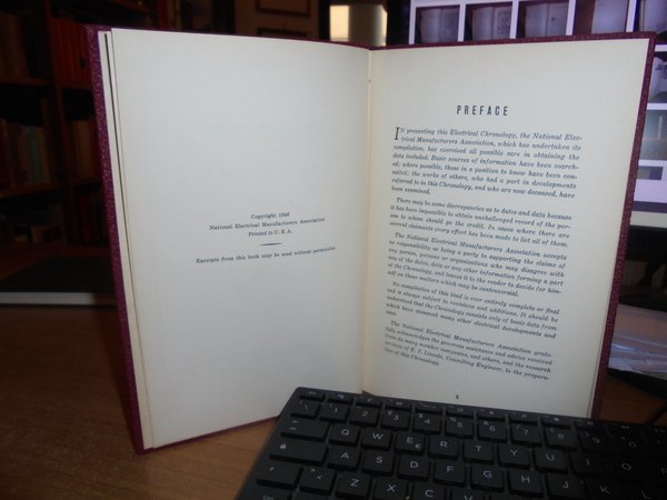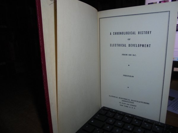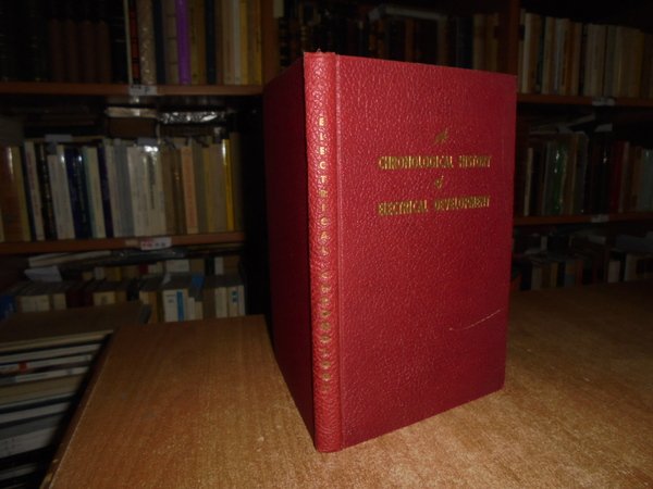 A Chronological History of Electrical Development from 600 B.C. New York, National Electrical Manufactures Association, 1946. In-8°, pelle bordeaux co titoli in oro sul piano e al dorso. 106 pp. + appendix + index. Ottimo stato con testo in inglese. Uff. C - I - 3