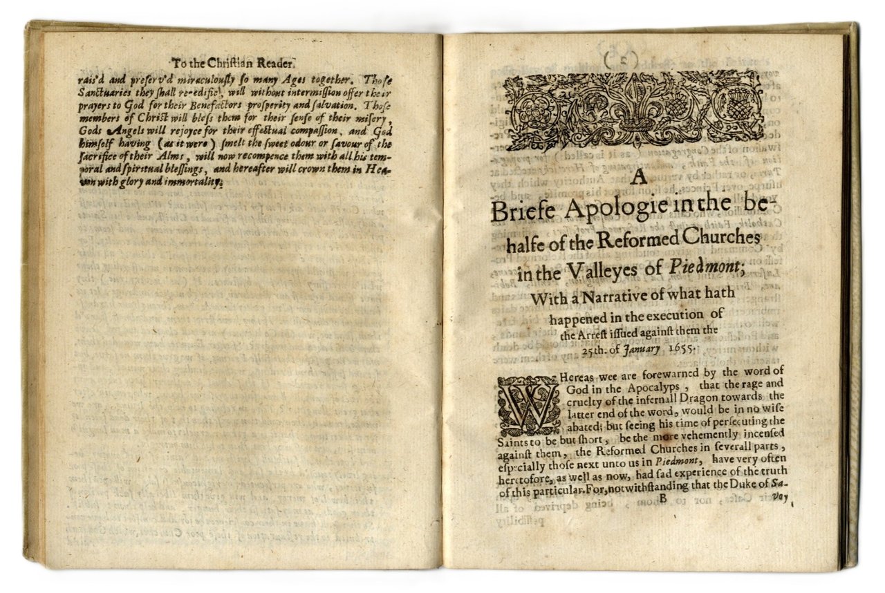 >in-8, (171x127 mm), pp. (16), 44; iniziali, testatine e finalini in xilografia. Legatura in piena pergamena floscia. Prima edizione, rarissima (censita in sole 3 biblioteche italiane); un'opera pressoché identica ma con titolo di poco diverso (A Collection or Narrative Sent to His Highness...) è stata stampata sempre da Robinson nello stesso anno, con talmente poche differenze che si possono considerare due varianti della stessa edizione. La collection è stata riunita dal pastore Jean-Baptiste Stouppe (1623-1692), ugonotto di origine italiana che negli anni Cinquanta del XVI secolo si trasferì in Inghilterra e fu impiegato da Oliver Cromwell in importanti missioni diplomatiche e di spionaggio. E' lui che firma la dedicatoria a Cromwell e probabilmente anche la lettera al Lord Protettore che chiude la raccolta, ma potrebbe anche aver redatto qualcuna delle altre 9 memorie raccolte nell'opera. "To the Christian reader", che serve da introduzione, è tra i testi più ricchi di informazioni e notizie sulla recente storia valdese, alcune riportate soltanto nella storia del Léger (cfr. Balmas). Gli altri opuscoli che compongono l'opera sono: A Briefe Apologie in the behalfe of the Reformed Churches in the Valleyes of Piedmont; With a Narrative of what hath happened in the execution of the Arrest issued against them the 25th. of January, 1655 - Andreas Galstaldus... appointed to put in execution all orders which are published against the pretended Reformed Religion, in the Valleys of Lucerne, Perouse, and St. Martin... Lucerne, 25th of January 1655 - A second Apology in the behalfe of the Reformed inhabiting the Valleys of Piedmont - A third Apologie for the said Churches against the Calumnies falsly imputed to them. An Appendix to the foregoing Apologie - An Abstract of a Letter writen from the Vale of Perouse the 17 of April 1655. Describing the beginning of the murders and cruelties committed on the said Reformed - Lyon, the 8th of May 1655 - A Continuation of the description of the murthers, and cruelties committed on the Reformed, in the Valleys of Piedmont, on the 6. and 7. of Aprill 1655. Ottimo esemplare.