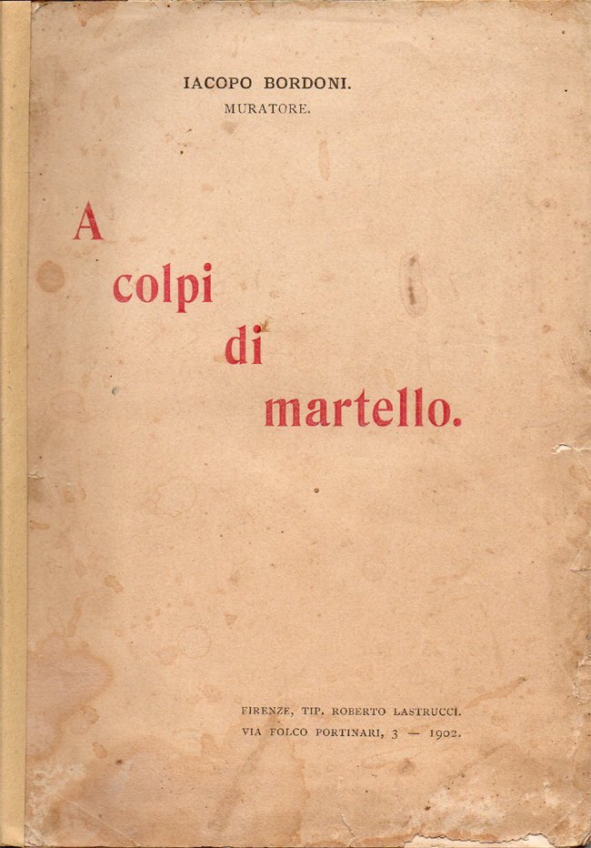 In-16°, pp. XIII, (1), 193, copertina editoriale con segni d'uso e del tempo (strappetti ai bordi, alcuni aloni d'umido, due conti a penna alla copert. posteriore). Dorso rifatto, con titoli manoscritti. All'antiporta, tavola fuori testo contenente un ritratto fotografico del Bordoni. Al recto della tavola fuori testo, firma d'appartenenza e poesia manoscritta, entrambe di mano coeva. Tre piccole macchie d'inchiostro nei margini bianchi delle pp. X e XI, che non toccano il testo. Mancanza di carta a p. 85, che lambisce marginalmente il testo, intaccando leggermente le ultime due lettere della parola "confine", nel sonetto "Sopra un tumulo". Per il resto esemplare più che buono di rara opera in edizione originale. Contiene i componimenti: Aurora; Io son fatto così; Guarda! È morta!; Agiatezza; Povertà; Ho paura; Ideale; Fata; Differenza d'idee; Andate in pace; Il giorno dei morti; In morte di Felice Cavallotti; Carità; Suicidio; Ultimo quadro; Antitesi; Sopra un tumulo; Giusti e ribelli; Ci si vede!; A Bice Bicci; Lucifero; Tentazione; Brutto come il peccato; Pranzi politici; Non desiderare la roba d'altri; Laboremus!; Eva; Dopo la lettura del "Quo vadis?" ; All'Amico dello scolare; Lui e lei; Sul margine di un torrente; Elegia; Era nuova; Reminescenze; Alla Musa. Dalla prefazione di Ersilio Bicci: «Iacopo Bordoni è un muratore di Poppi: un muratore vero e autentico, con le mani scabre, con la fronte arsiccia, e con le palpebre e i baffi bianchi di calcina; il quale mantiene in vita sé e la sua famiglia coi trenta soldi della giornata, e digiuna co' suoi, se la cazzuola stia inoperosa. Ho insistito sulla qualità e veracità del lavoro perché oggi molti si dicono operai che vivono in ozio; e dal circolo al caffè, dalla osteria alla biscazza, spendendo e spandendo soldi d'ignota provenienza, mercanteggiano coscienze e cantano inni al lavoro». Franco Bertolucci, direttore della Biblioteca Franco Serantini di Pisa, nel suo scritto Antonio Gamberi, ateo convinto e fermo socialista. Appunti per una biografia, così tratteggia la figura del Bordoni, poeta autodidatta: «Jacopo Bordoni nasce il 30 agosto 1860 nel paese di Soci frazione di Poppi (AR). Dopo la scuola elementare segue il padre nel lavoro di muratore. Nelle ore del riposo e della notte coltiva la passione per la lettura con una particolare attenzione per Giosuè Carducci, Edmondo De Amicis e Ada Negri. Ribelle e anticlericale nelle sue poesie si nota una concezione del socialismo umanitario e generico. Nel 1893 pubblica la sua prima opera, Sventura, stampata a Poppi dal tipografo Vignali, ma le due opere principali che attirarono l'attenzione dei contemporanei furono A colpi di martello, edita a Firenze nel 1902 e il Canzoniere stampato a Roma con una prefazione di Paolo Orano che definisce il poeta/muratore un “fenomeno letterario”. Nei decenni seguenti Bordoni abbandona progressivamente la sua poesia/militante e le idee che la ispirarono per avvicinarsi a posizioni moderate. Dopo la marcia su Roma, pur non aderendo formalmente al regime, nelle sue poesie esprime una sostanziale condivisione delle scelte politiche del fascismo. Muore a Poppi nel 1936»