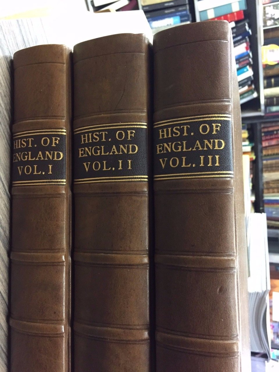 There of; From The Earlieft Account of Time, to the Death of His Late Majesty King William III. Containing A Faithful Relation of all Affairs of state Ecclesiastical and Civil. The Whole illustrated with Large and useful notes, taken from disvers manuscripts, and other Authors: and the effiges of the Kings and Queens from the Originals, Engraven by the beft Masters. In Three Volumes, with Alphabetical Indexes to each. PRIMO Volume. I. Beginning with the History of Britain to William the conqueror By Mr John Milton. II. From the Conquest to the End of the King Edward III. By Samuel Daniel, Esq; III. The Reigns of King Eichard II. King Henry IV, V, and VI All new Writ in Mr Daniel's Method. IV. The Reign of King Edward. By John Habinghton, Esq. V. The lives of king Edward V. and RIchard III. By Sir Tho. Moore. Translated from the Latin Original. VI. The life of King Richard III. By George Buck, Esq; VII. The Life of King Henry VII. By Francis Lord Bacon. The Second Edition Corrected, With amendments, and Additions to the trird Volume. London. Printed for R. Bonwicke, Tim Goodwin, J. Walthoi, J. Wotton. 1719, in folio, pp. 10nn.+640+24 nn. di indici, con 18 tavole finemente incise raffiguranti i re a piena pagina e fuori testo. Riparazioni artistiche e professionali ai margini di alcune pagine che non ledono la leggibilità del testo. SECONDO Volume. Containing: I. The History of King Henry VIII. Written by the Right Honorable Edward Lord Herbert of Cherbury. II. The Life of King Edward VI. By Sir John Hayward. III. The Life of Queen Mary. Wirtten in Latin by Francis Godwin , Lord Bishop of Hereford, newly Translated into English by Mr F.H. IV The history of Queen Elizabeth. Written by William Cambden, Esq; Clarencieux King at Arms; newly done into English. V. The annals of King James I. By the faid Mr. Cambden. VI. The History of king Kames I. By Arthur Wilson ESQ. London 1706, in folio, pp. 2nn. +792+20 di indici, con 5 magnifiche tavole fiemente incise raffiguranti i re f.t. Segni di tarletto ai margini bianchi interni che non ledono assolutamente il testo e interessano il margine bianco. Errori di numerazione nel testo. TERZO volume. Continaing. I. The History and Life of King Charles I. II. The History of King Charles II. III. The History of King James II. IV. The History of King William anc Queen Mary. V. The History of King William III. All new writ by Learned and Imperial Hand. London 1706, pp. 2nn.+849+24 di indici, con 5 splendide tavole finemente incise f.t. Errori di numerazione nel testo. Testo su due colonne. Note marginali. Opera completa artisticamente trattata e riparata nei suoi difetti. Legatura pieno cuoio con tassello e tit. in oro al dorso. Nel complesso ottimo stato di conservazione. Raro.