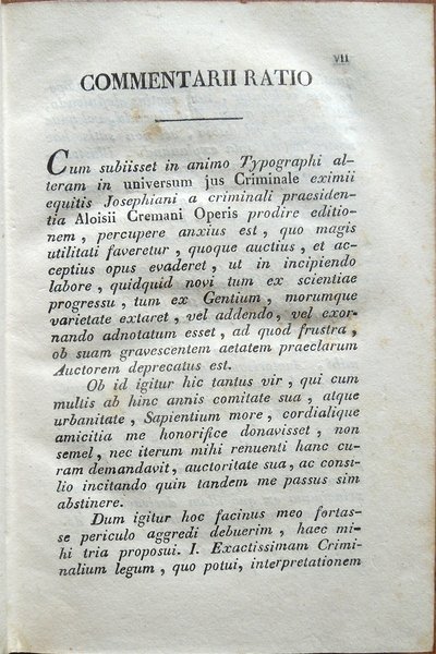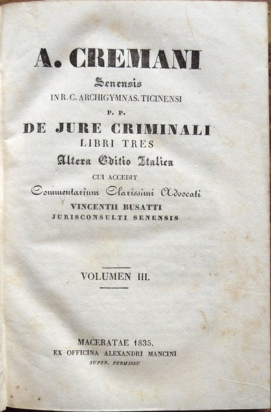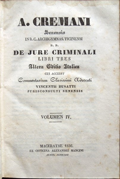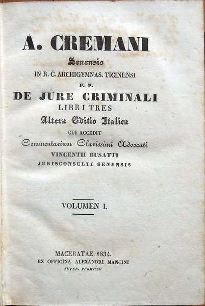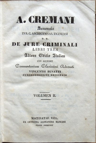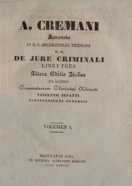 A. Cremani senensis in R. C. Archigymnas. Ticinensi P. P. De jure criminali libri tres. Altera Editio Italica cui accedit Commentarium Clarissimi Advocati Vincentii Busatti jurisconsulti senensis