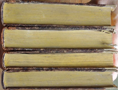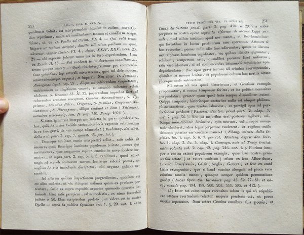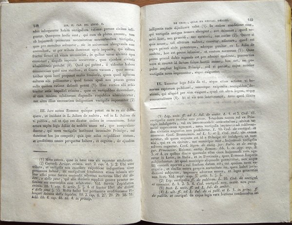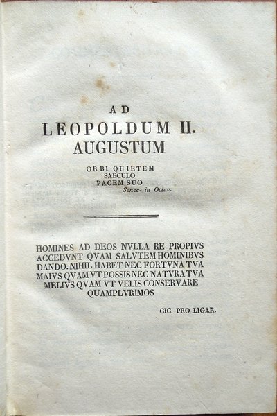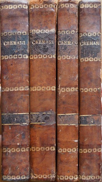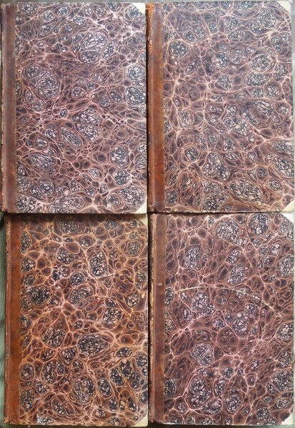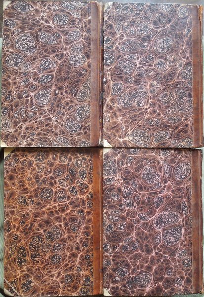 Quattro volumi in-16° (19,2 x 13 cm), pp. XLVI, 421, (1); 414, (2); 333, (3); 359, (1); legatura coeva in mezza pelle con angoli in pergamena, titoli e fregi in oro ai dorsi. Normali segni d'uso e del tempo alla legatura, in particolare, mancanze ai tasselli con i titoli al dorso. Tagli colorati in giallo. Al verso della carta ospitante al recto l'occhietto, dedica dell'autore del commentario ad un importante membro del governo toscano. Al terzo volume, nella parte inferiore di pagina 145, piccolo strappo, senza perdite, rimarginato da intervento di restauro eseguito con carta giapponese; sempre al terzo volume, alle pagine 224-225, la rimozione di un'aderenza provocata, con tutta probabilità, da una goccia di cera caduta anticamente su una delle due pagine in questione, ha determinato, nell'ottavo e nono rigo di pagina 224 e nel quinto di pagina 225, la caduta di pochissime lettere, ben reintegrate a matita. Al quarto volume, lieve alone d'umido nel bordo superiore del frontespizio. Qualche piccolo segno d'umido alle pagine, per il resto, esemplare ben conservato.