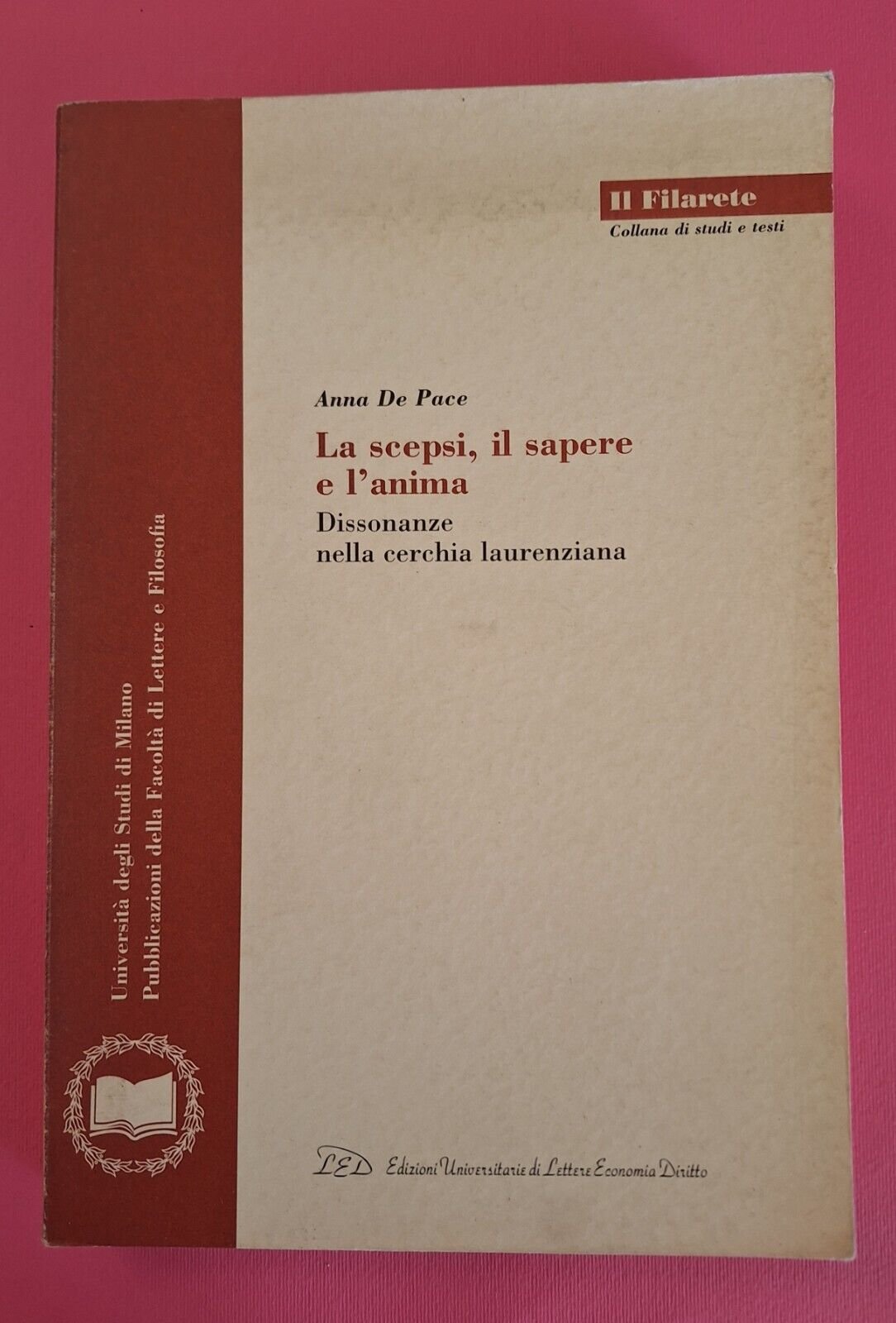 A. DE PACE LA SCEPSI IL SAPERE E L'ANIMA LED 2002In 8°, legatura editoriale, copertina illustrata.In ottime condizioni, lievissimi segni alla copertina.