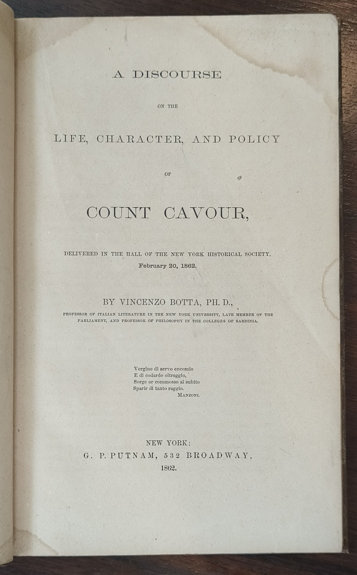 Vincenzo Botta, A discourse on the life character and policy of Count Cavour, New York, G.P. Putnam, 1862