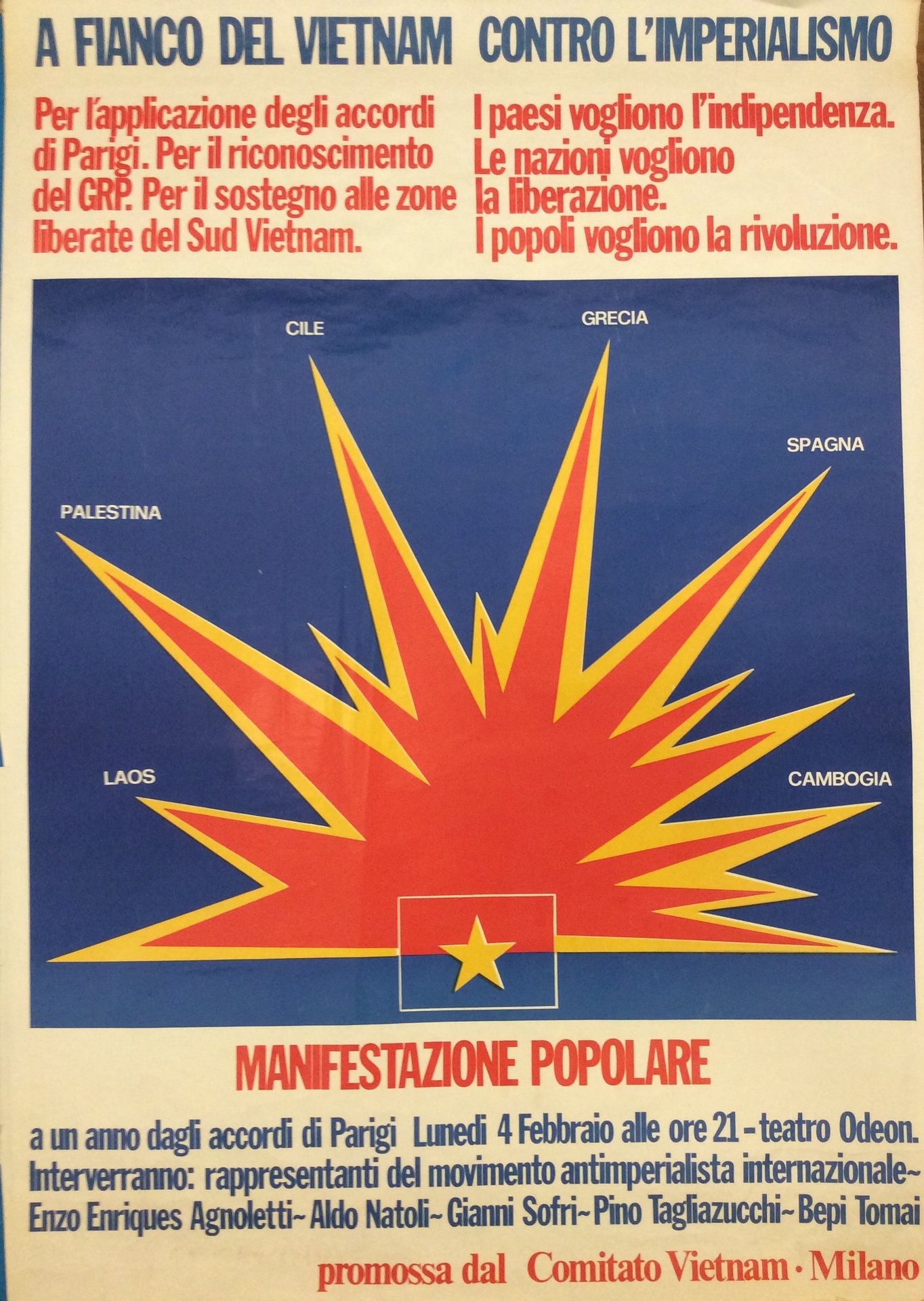 Manifesto litografico a colori (cm. 100x70), titoli in blu e rosso su fondo bianco; al centro, in piccolo, la bandiera dei vietcong e il disegno di un'esplosione con le scritte Laos - Palestina - Cile - Grecia - Spagna - Cambogia. Manifestazione tenutasi a Milano, al Teatro Odeon, Lunedì 4 febbraio alle ore 21 a un anno dagli accordi di Parigi. Interverranno: rappresentanti del movimento antimperialista internazionale - Enzo Enriques Agnoletti - Aldo Natoli - Gianni Sofri - Pino Tagliazucchi - Bepi Tomai. Per l'applicazione degli accordi di Parigi. Per il riconoscimento del GRP (Governo Rivoluzionario Provvisorio del Vietnam del Sud). Per il sostegno alle zone liberate del Sud Vietnam - I paesi vogliono l'indipendenza. Le nazioni vogliono la liberazione. I popoli vogliono la rivoluzione. Ben conservato.