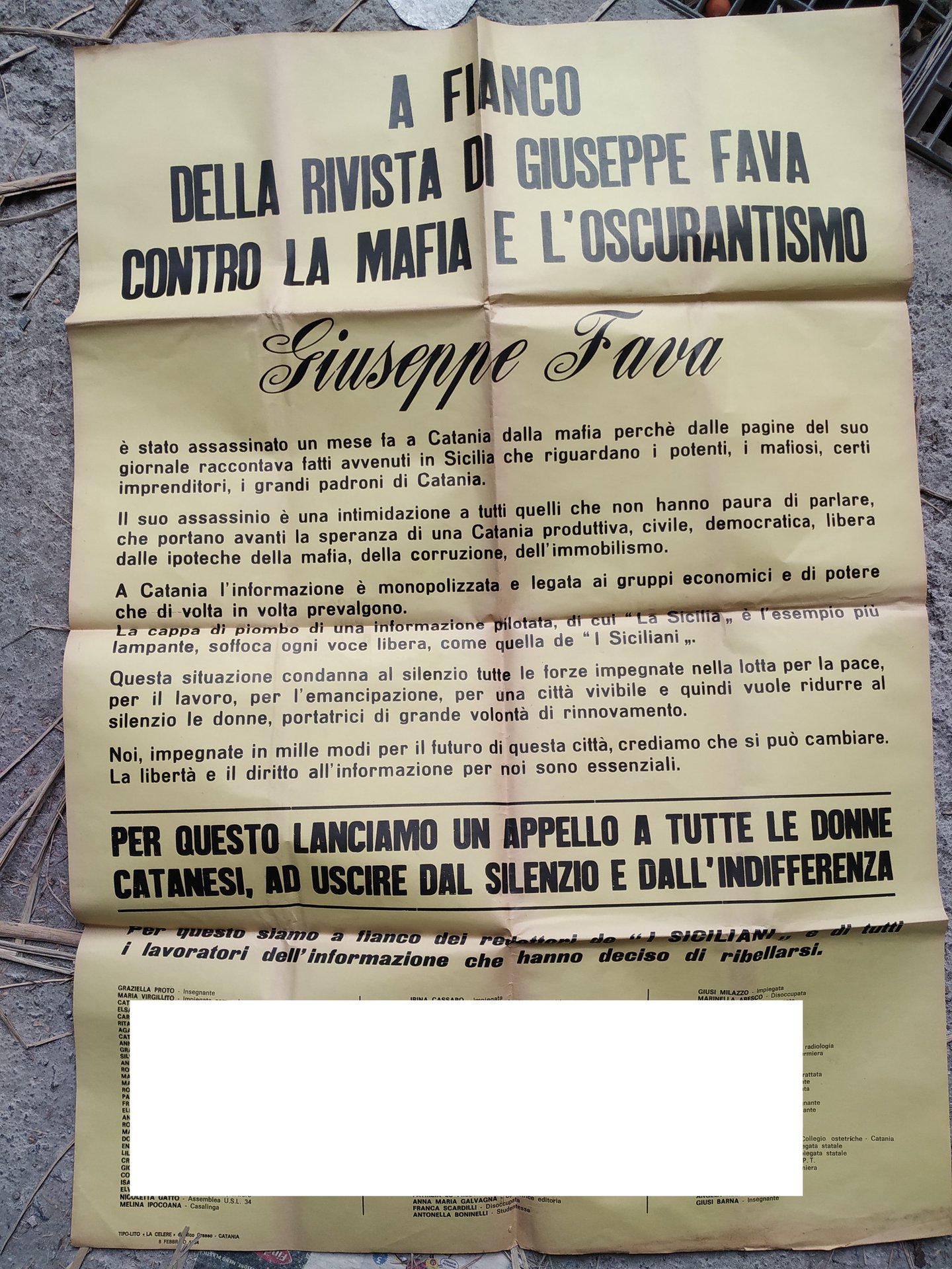 poster giuseppe PIPPO fava a fianco della rivista epitaffio dopo la sua morte contro la mafia e l'oscurantismo (con elenco donne catanesi attiviste)2. .