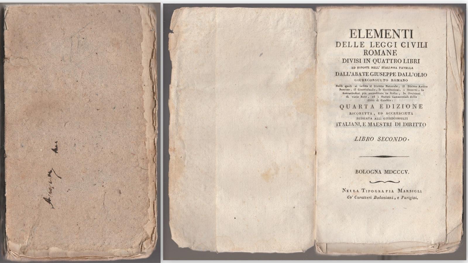 ELEMENTI DELLE LEGGI CIVILI ROMANE DIVISI IN QUATTRO LIBRI ED ESPOSTE NELL'ITALIANA FAVELLA DALL'ABATE GIUSEPPE DALL'OLIO SECONDO VOLUME QUARTA EDIZIONE BOLOGNA 1805 NELLA TIPOGRAFIA MARSIGLI