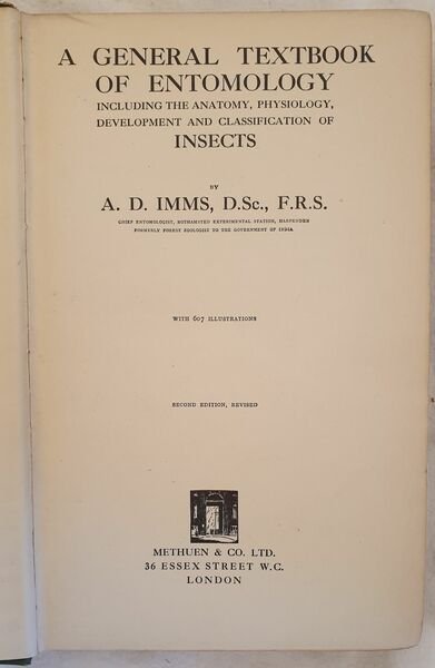 Seconda edizione del 1930 di questo manuale di entomologia scritto da Imms. All'interno: Anatomia e fisiologia, Sviluppo e metamorfosi, Descrizione degli ordini degli insetti, Indice degli autori e indice generale ecc. Testo inglese imrpeziosito da 607 illustrazioni nel testo. Firma di appartenenza datata 1932. In buone condizioni. Copertina in tela editoriale in discrete condizioni generali con usure ai margini e dorso. Legatura in discrete condizioni con qualche lieve rottura. Pagine in buone condizioni con fioriture. In 8. Dim. 26x17,5 cm. Pp. X+703+(1). Peso Kg. 1,580 Second edition of 1930 of this manual of enthomology written by Imms. Inside: Anatomy and physiology, Development and metamorphosis, Description of orders of insects, Index of authors and general index ecc. English text with 607 black and white illustrations. Signature dated 1932. In good conditions. Cloth editorial cover in fair general conditions with wearings in the extremities. Binding in fair conditions lightly disbound. Pages are in good conditions with foxings. In 8. Dim. 26x17,5 cm. Pp. X+703+(1). Weight Kg. 1,580