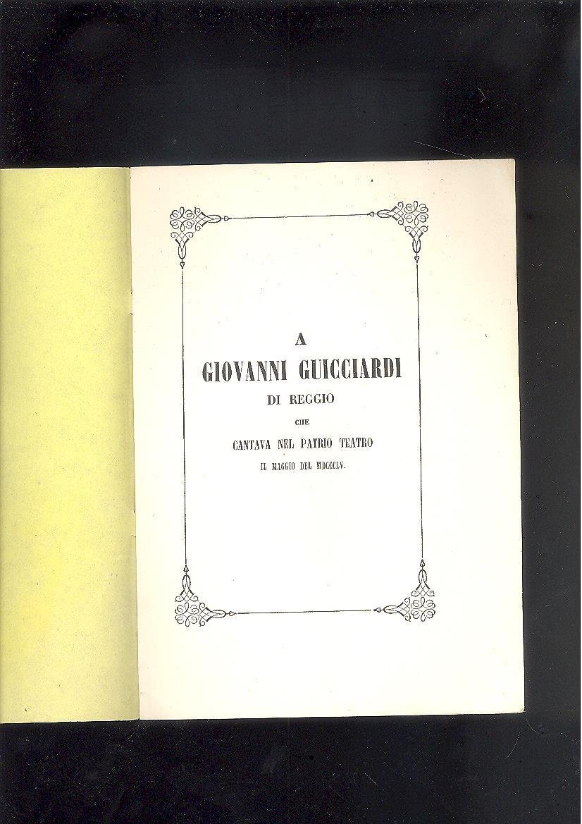IN 8°, c.4.TITOLO ENTRO CORNICE + BROSSURA MUTA. INTRODUZIONE CON DEDICA AL DILETTISSIMO AMICO, GLI AFFEZIONATISSIMI VOSTRI N. N. , REGGIO 24 MAGGIO 1855.<BR>GIOVANNI GUICCIARDI ( REGGIO EMILIA 1819 - SAN POLO D'ENZA 1883 ), BARITONO ITALIANO CHE CANTO IMPORTANTI RUOLI IN TEATRI ITALIANI E PORTOGHESI. FAMOSO PER AVER CREATO IL PERSONAGGIO DEL CONTE DI LUNA NEL TROVATORE DI VERDI. OTTIMA CONSERVAZIONE. ID, 7075