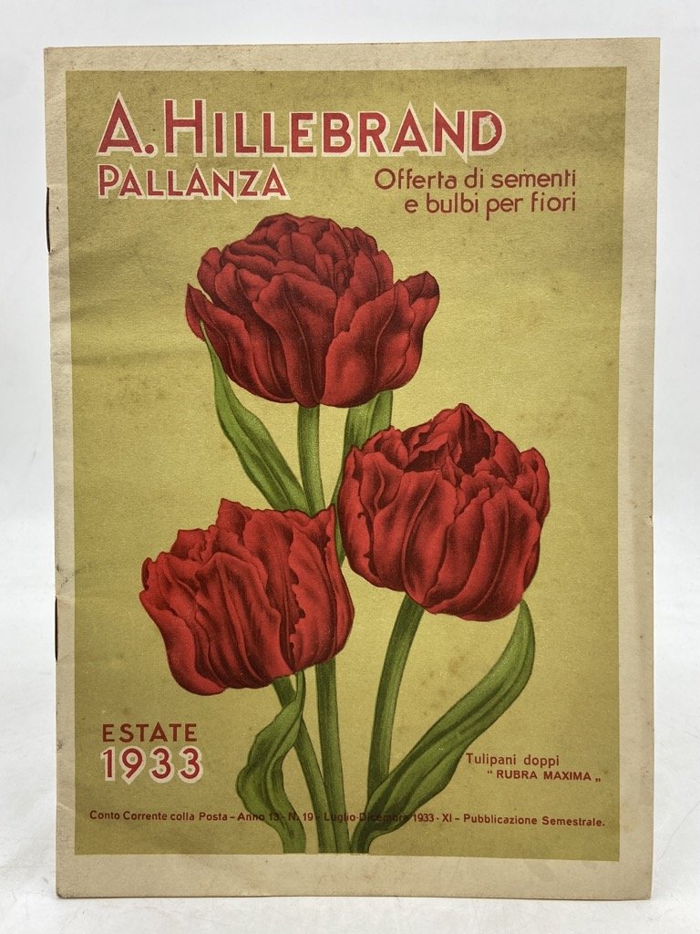 Catalogo commerciale spillato, brossura editoriale illustrata, cm 24 x 17, pp 20 stampate in blu con illustrazioni. Catalogo Estivo N. 13, luglio 1933, dedicato a Sementi da Fiori e da Orto e Bulbi da fiore. Sul piatto anteriore illustrazione dei tulipani “Rubra Maxima”.