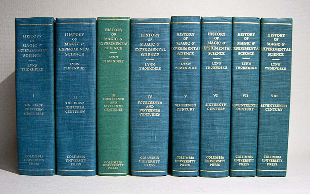 Vol. 1 XL, (2), 835 pp.; Vol.2 (6), 1036 pp.; Vol. 3 XXVI, 827 pp.; Vol. 4 XVIII, 767 pp.; Vol. 5 XXII, 695 pp.; Vol. 6 XVIII, 766 pp.; Vol. 7 X, 695 pp.; Vol. 8 VIII, 808 pp. Un'opera fondamentale che ripercorre lo sviluppo della magia e della scienza dall'antichità fino al diciassettesimo secolo. Copre arti e scienze occulte, superstizioni e folklore. Ampie bibliografie e indici.
