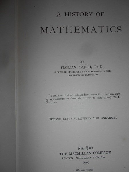 by FLORIAN CAJORI. New York, The MacMillan Company, 1919. A HISTORY of MATHEMATICS . In-8° piccolo, tela edit. con titoli in oro al dorso. viii, 516 pp. In ottimo stato di conservazione. Uff. C - I - 6