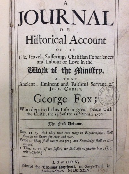 In-8 gr. (mm. 278 x 170), legatura ottocentesca in mz. pelle con angoli, dorso a cordoni e titolo oro, pp. XVIII,632,(16). "Prima edizione" di questa celebre opera che fu sovente ristampata, anche nel Novecento. Cfr. Bateson,II,855 - Graesse,II,622 - Brunet,VI,22524. Predicatore inglese e teorico del principio della tolleranza (1624-91) il Fox fondò a metà Seicento la setta protestante dei Quaccheri. Irruente parlatore e scrittore efficace (il suo "Journal" è un classico, non solo nella mistica), il Fox ha dei punti di contatto (specie nel valore dato alla rinascita spirituale) con J. Boehme. Ma la principale ragione del suo successo sta forse nel fatto che egli unì l'insistenza sulla semplicità dei modi nei rapporti umani e la protesta contro il culto meramente esteriore e contro le ingiustizie sociali, all'altra protesta contro il rigido predestinazionismo calvinista. Così Diz. Treccani,V, p. 51.Timbro di apparten. al frontesp.; prime e ultime 3 carte con antico restauro per manc. margin. che intaccano anche alc. lettere del testo; con lievi aloni o fiorit. ma complessivam. discreto esemplare.
